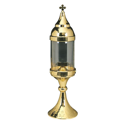 This monstrance is cylindrical and ambrosian style made with gold-plated brass. This ambrosian monstrance was hammered by hand in silver plated brass and measures 47 cm high.