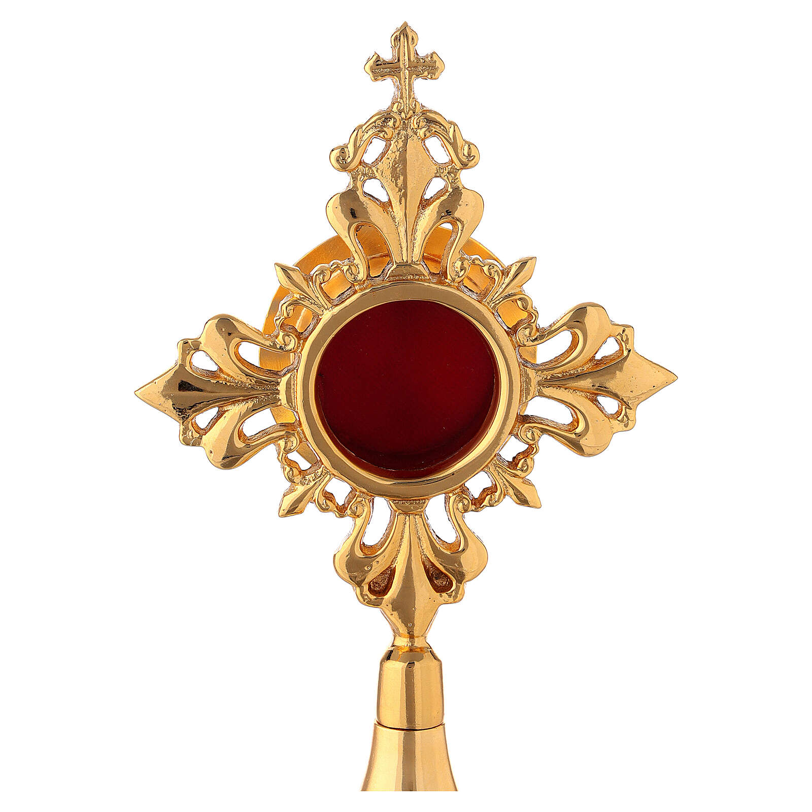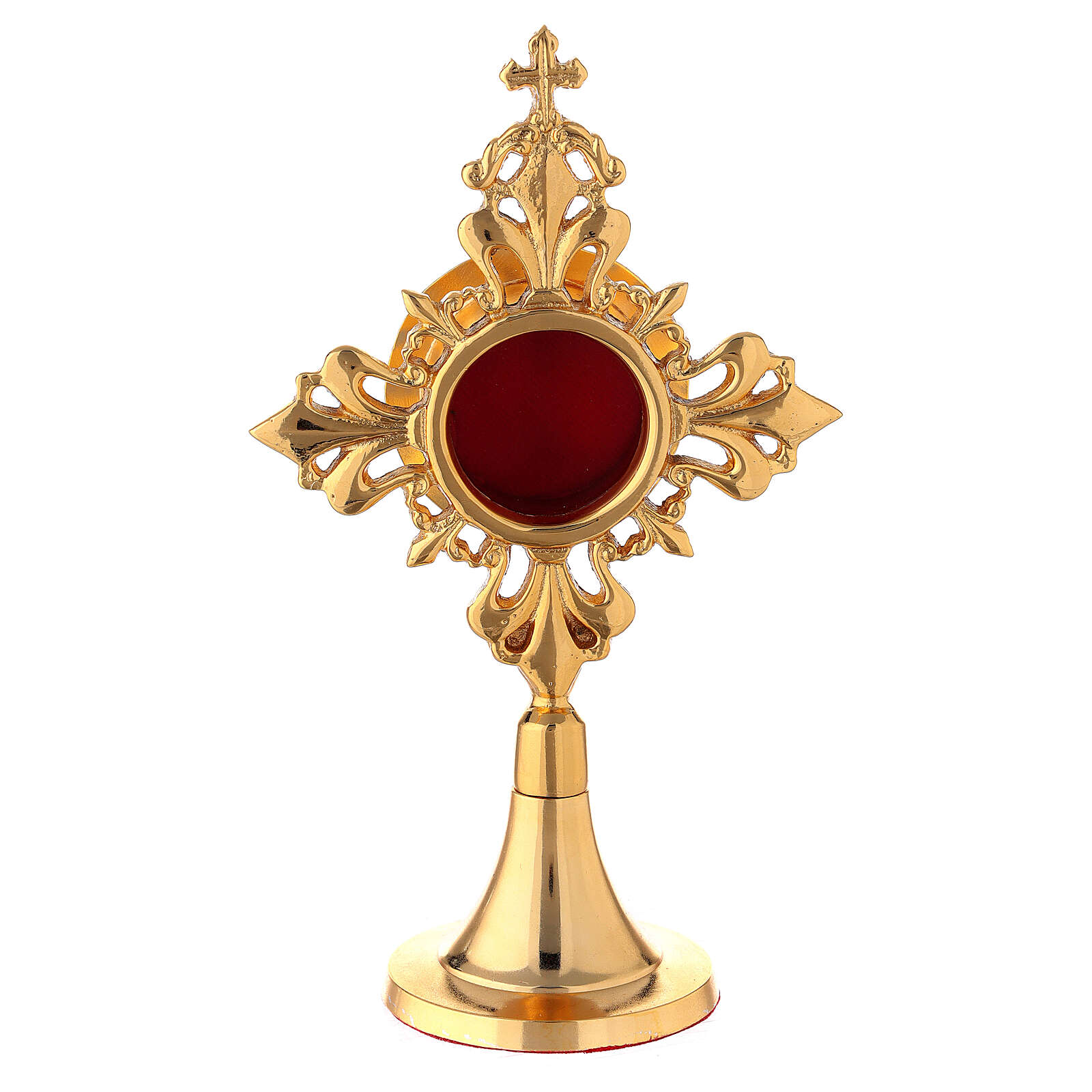 Round reliquary with lilies in gold plated brass 6.7 inches. Small reliquary made of gold plated brass with bell-mouthed smooth base and a square frame decorated with stylized lilies and a cross on the top. The circular viewing window is lined in red velvet.