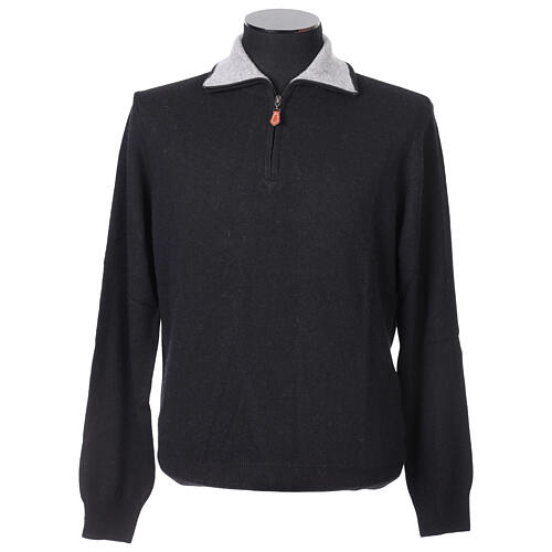 Black truck driver zip sweater 10% cashmere, 40% merino wool. Stylish truck driver full zip sweater by In Primis, presented in an elegant black with a contrasting grey inner collar for a distinctive and sophisticated detail. Crafted with a premium blend of materials: 10% cashmere, 40% merino wool, 25% viscose, and 25% nylon, designed to provide comfort and warmth on colder days. Made in Italy, this garment reflects the craftsmanship and excellence of Made in Italy, ensuring quality and attention to detail. Available in sizes S, M, L, XL, and XXL for a perfect fit suitable for every style.