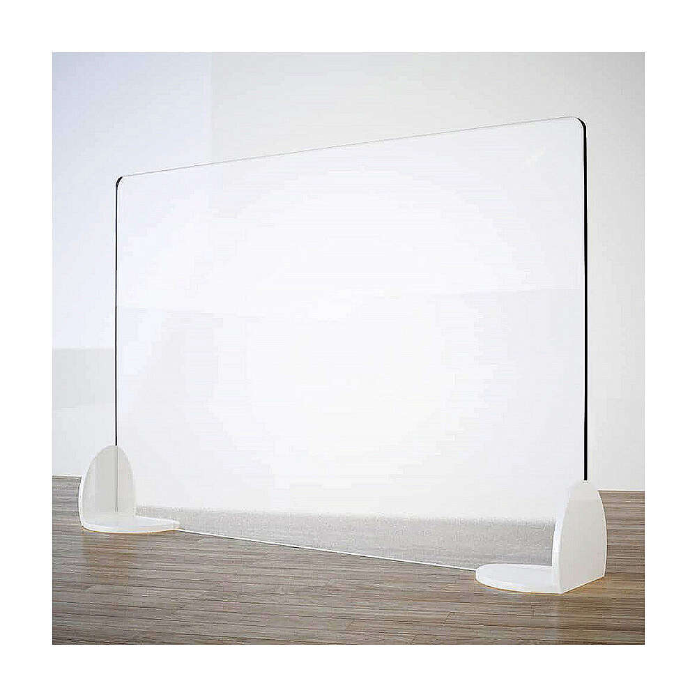 This free standing sneeze guard has supports which cover 15 cm (7.5 cm per side). It is portable and easy to install. The acrylic screen has rounded edges and can be cleaned with pure alcohol or a 70% solution. It is impact resistant and light, can be used in any setting to protect against contagion.