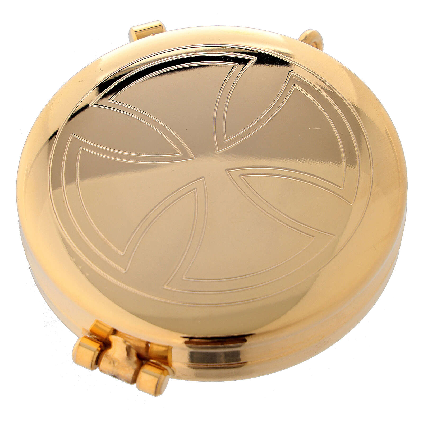 Gold plated pyx with engraved Maltese cross 2.1 inches. Pyx made of 24-karat gold plated brass with Maltese cross engraving.
