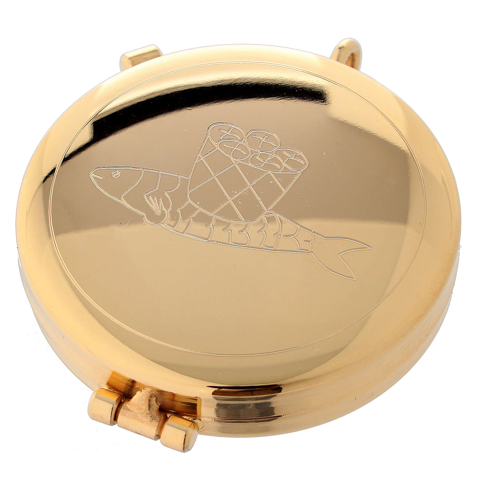 Gold plated pyx with loaves and fish engraving 2.1 inches. Pyx made of 24-karat gold plated brass with loaves and fish engraving.