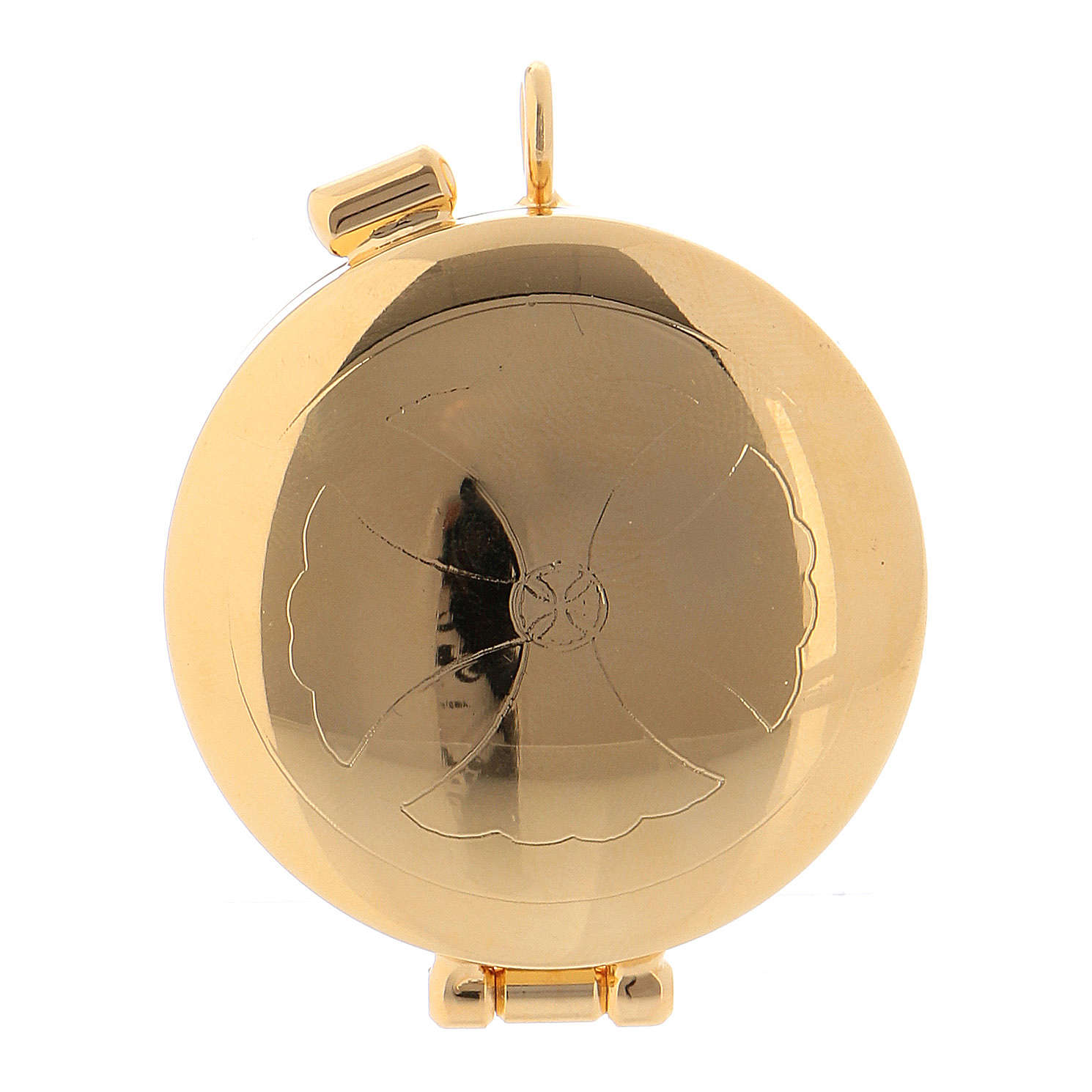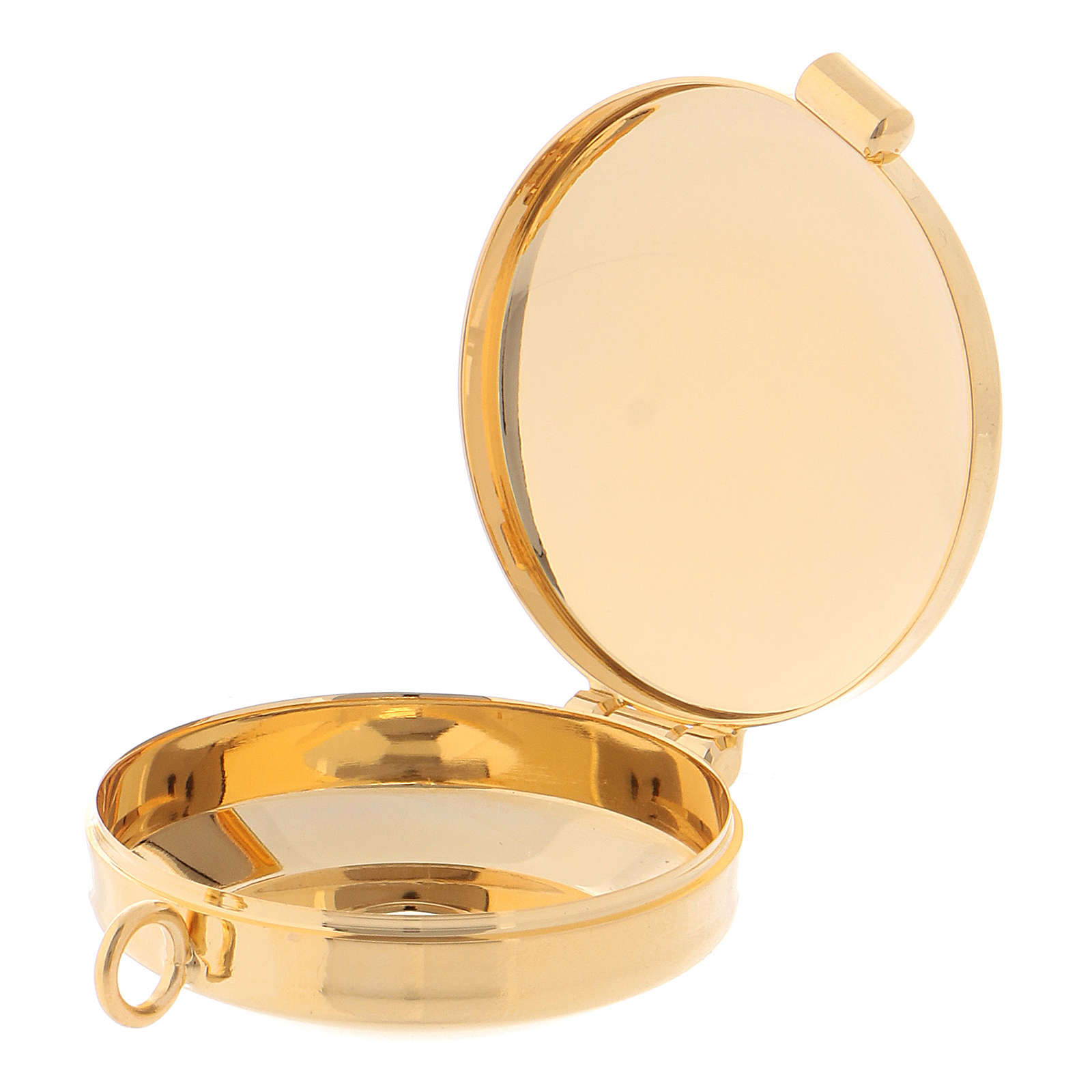 Small golden brass pyx, it can contain some hosts. The decoration on the top depicts and inlayed cross. It has a ring in order to allow wearing it round the neck.