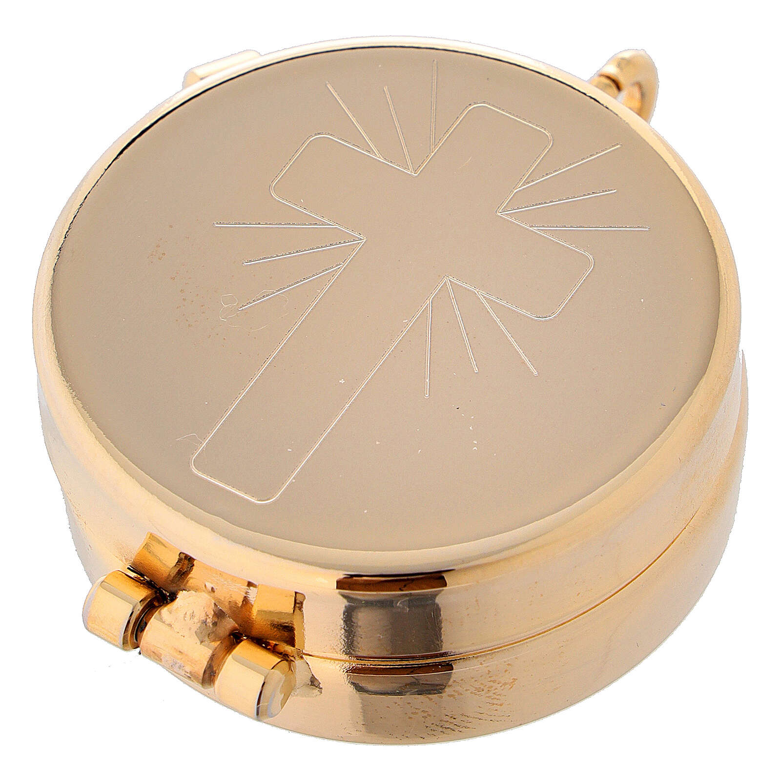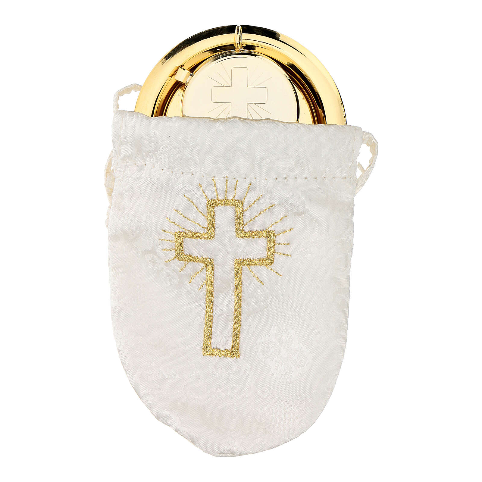 IHS white burse and pyx. Burse made of white damask fabric with gold embroidered cross, containing a pyx with engraved cross, a paten, a cross and a purificator.