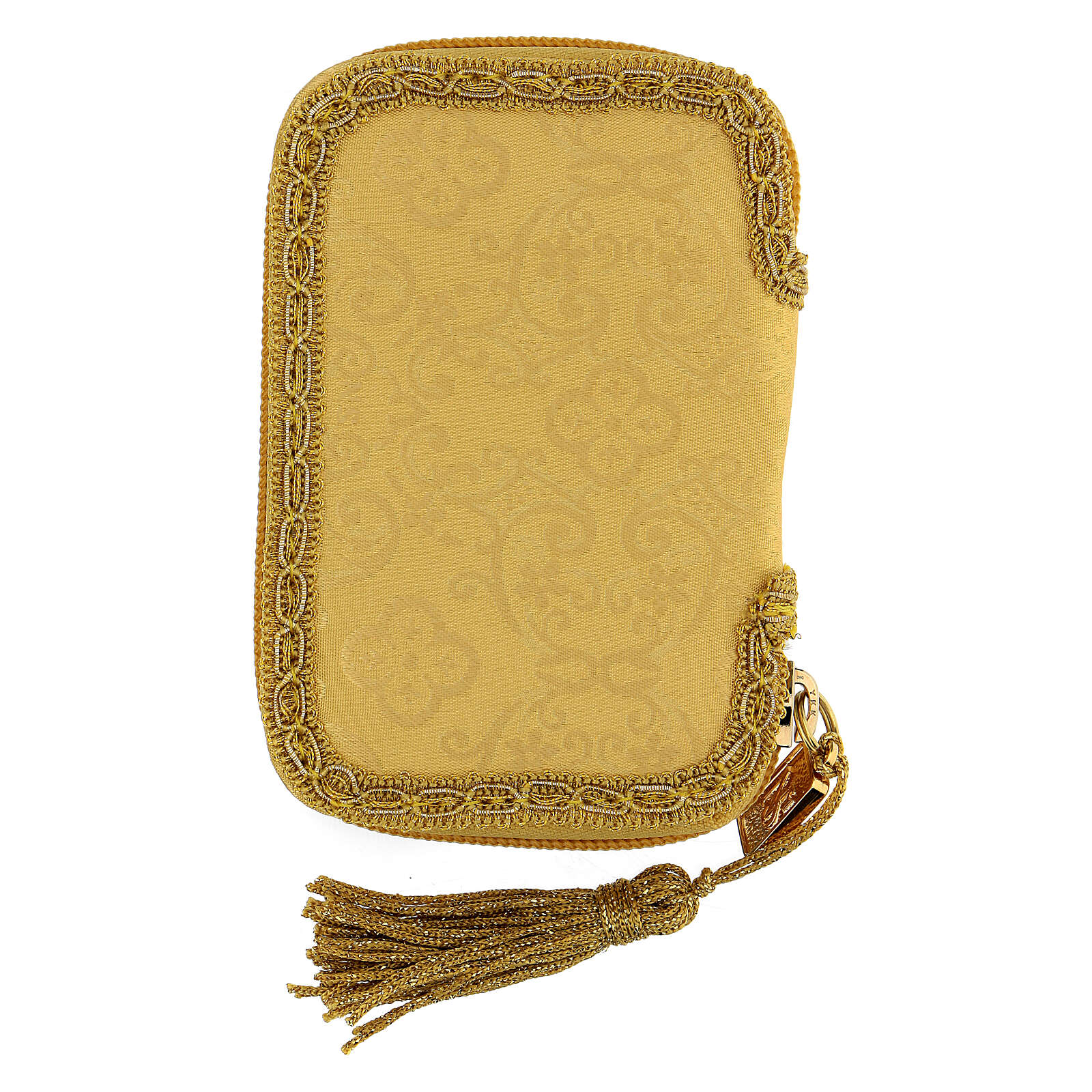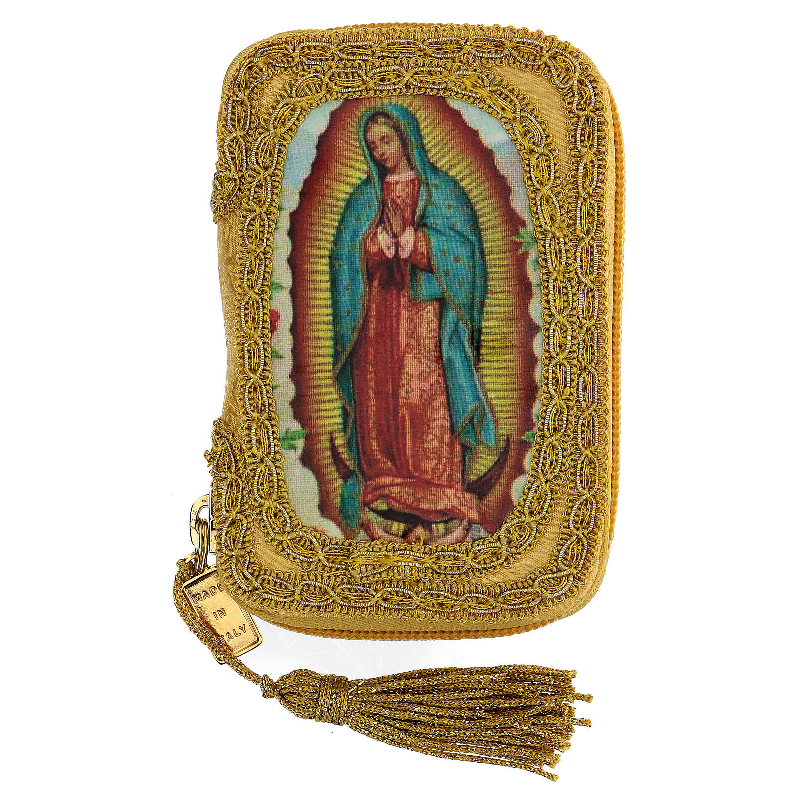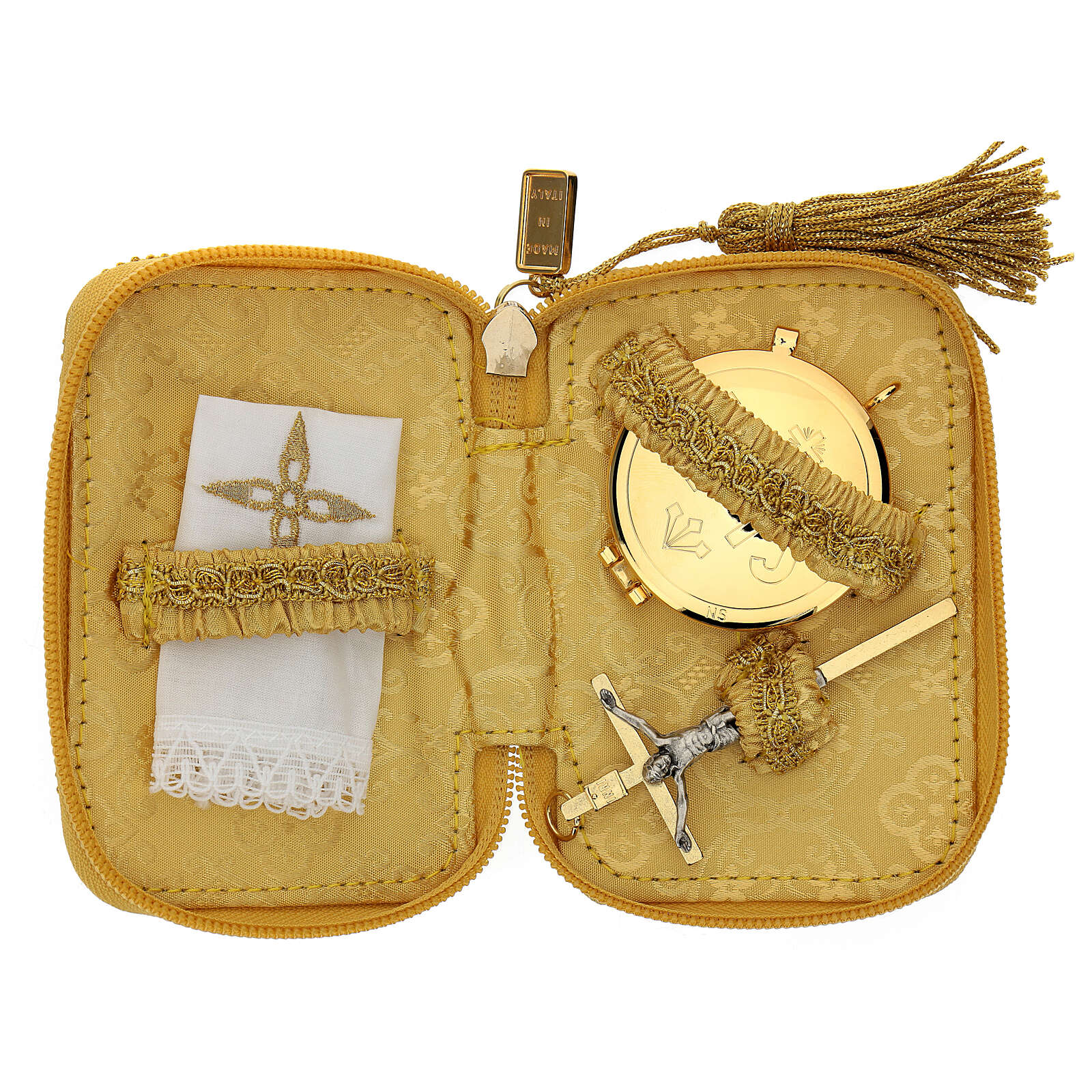 Our Lady of Guadalupe golden burse with 2 inches pyx. Richly embroidered burse with Our Lady of Guadalupe image and golden fabric, containing a pyx of 2 inches diameter with IHS engraving, a white purificator with golden embroidery and a gold plated brass crucifix with nickel-plated Body of Christ.