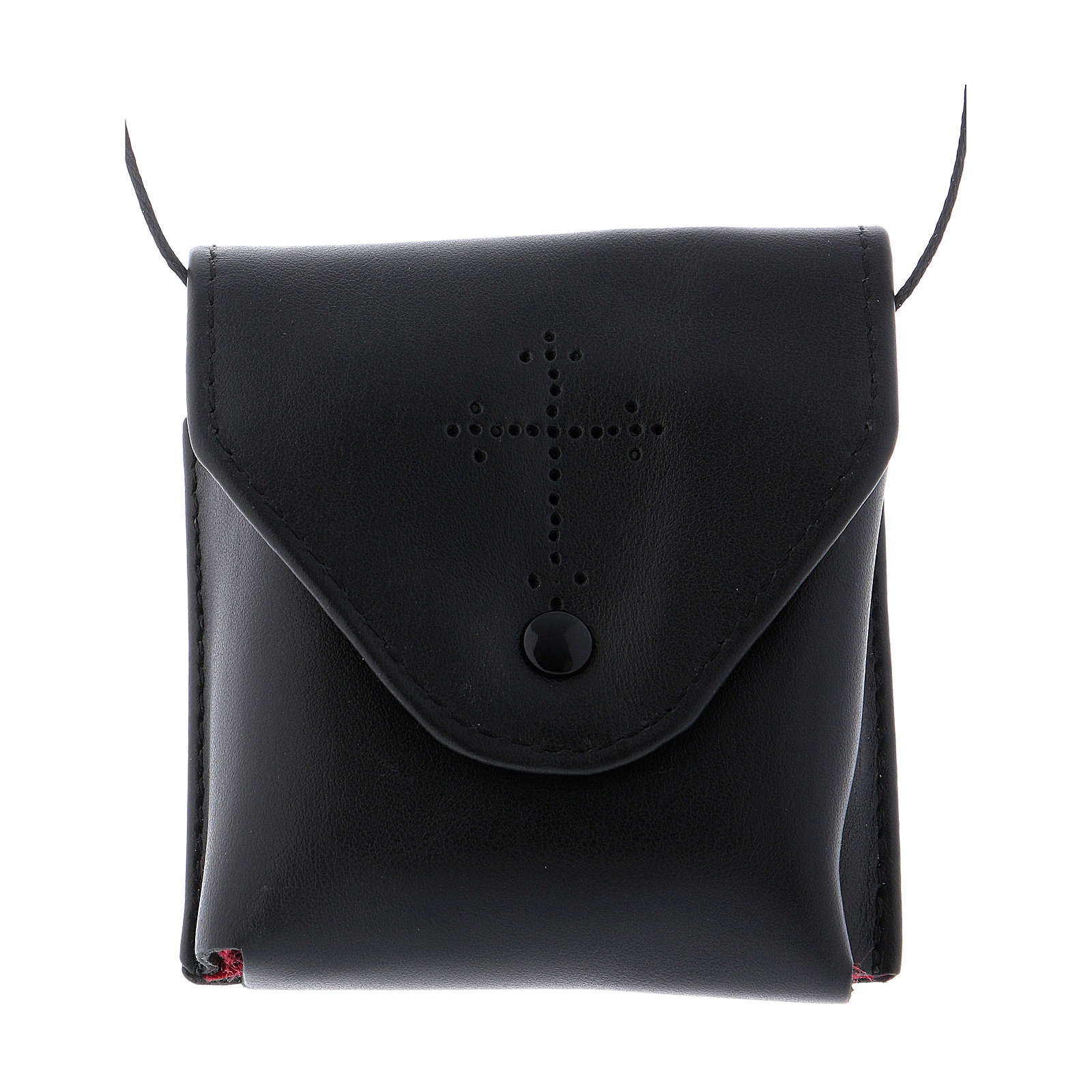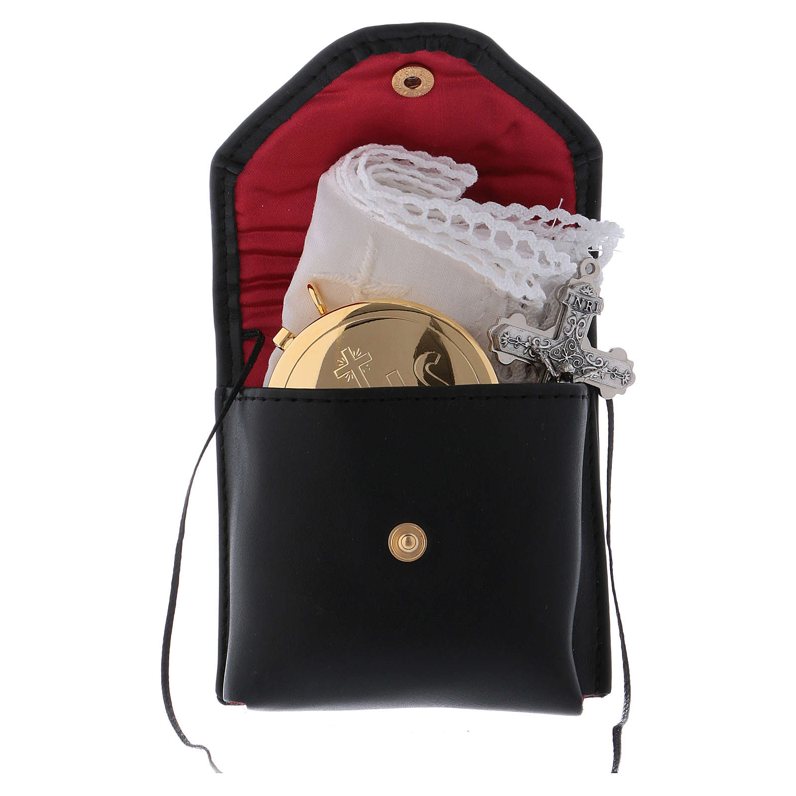 Pyx and burse in leather and satin. Hand-made pyx holder in real leather and red satin; this burse contains a pyx 5.5cm diameter, a small cross and a smals linen.The pyx holds up to 10 hosts.