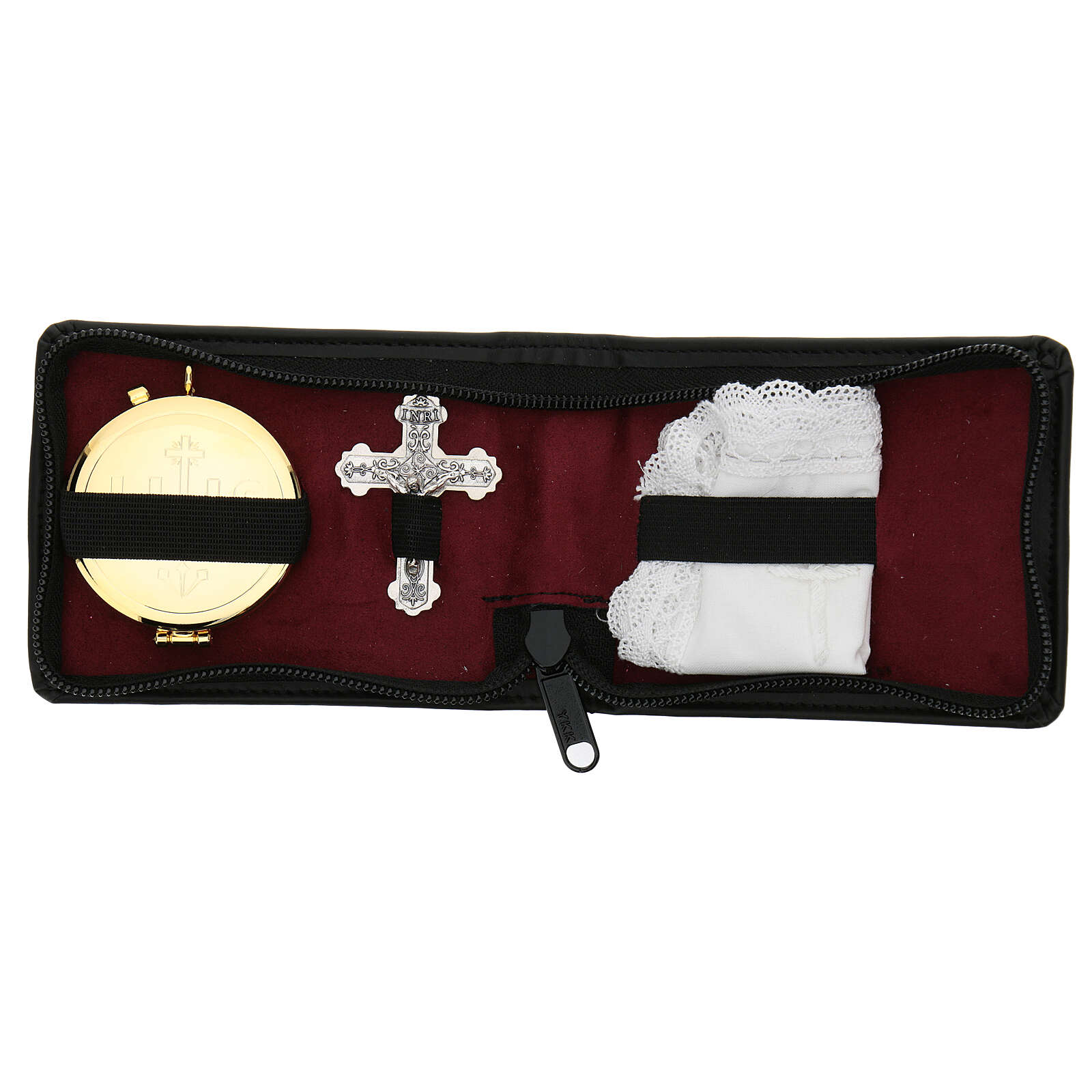 Pyx holder in real leather complete with included pyx, cross and a small linum handkerchief. This product is hand-made.