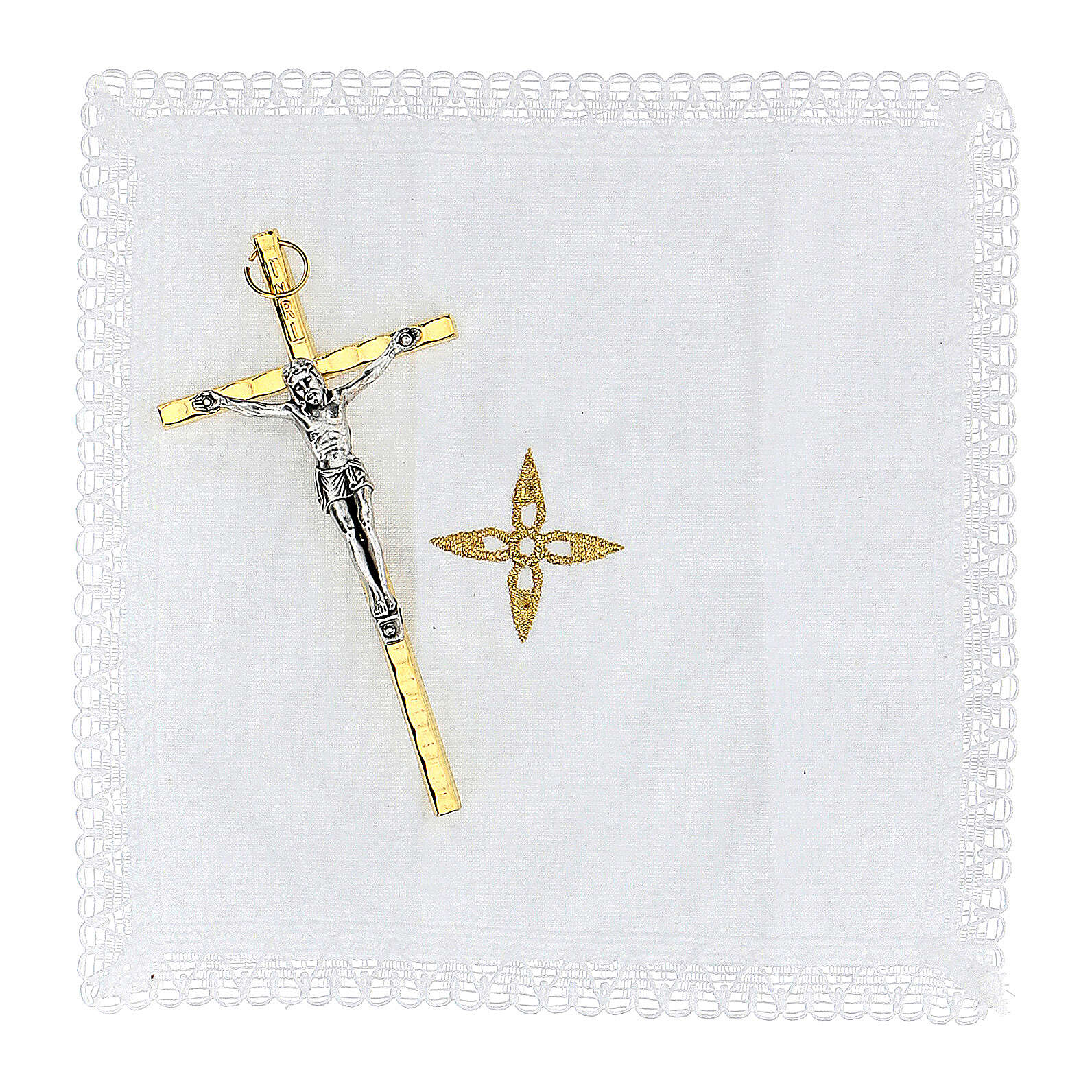 The burse contains also an embroidered purificator and a gold plated brass crucifix with mat nickel-plated Body of Christ.