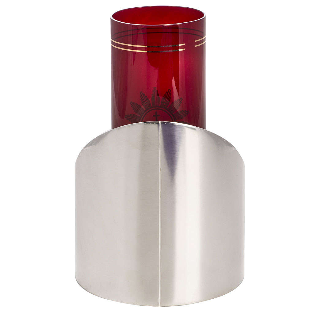 This Blessed Sacrament lamp features geometrical lines and formal traits; it's entirely hand moulded and it's made of satin brass outside and polished brass in the parts that are closer to the glass.