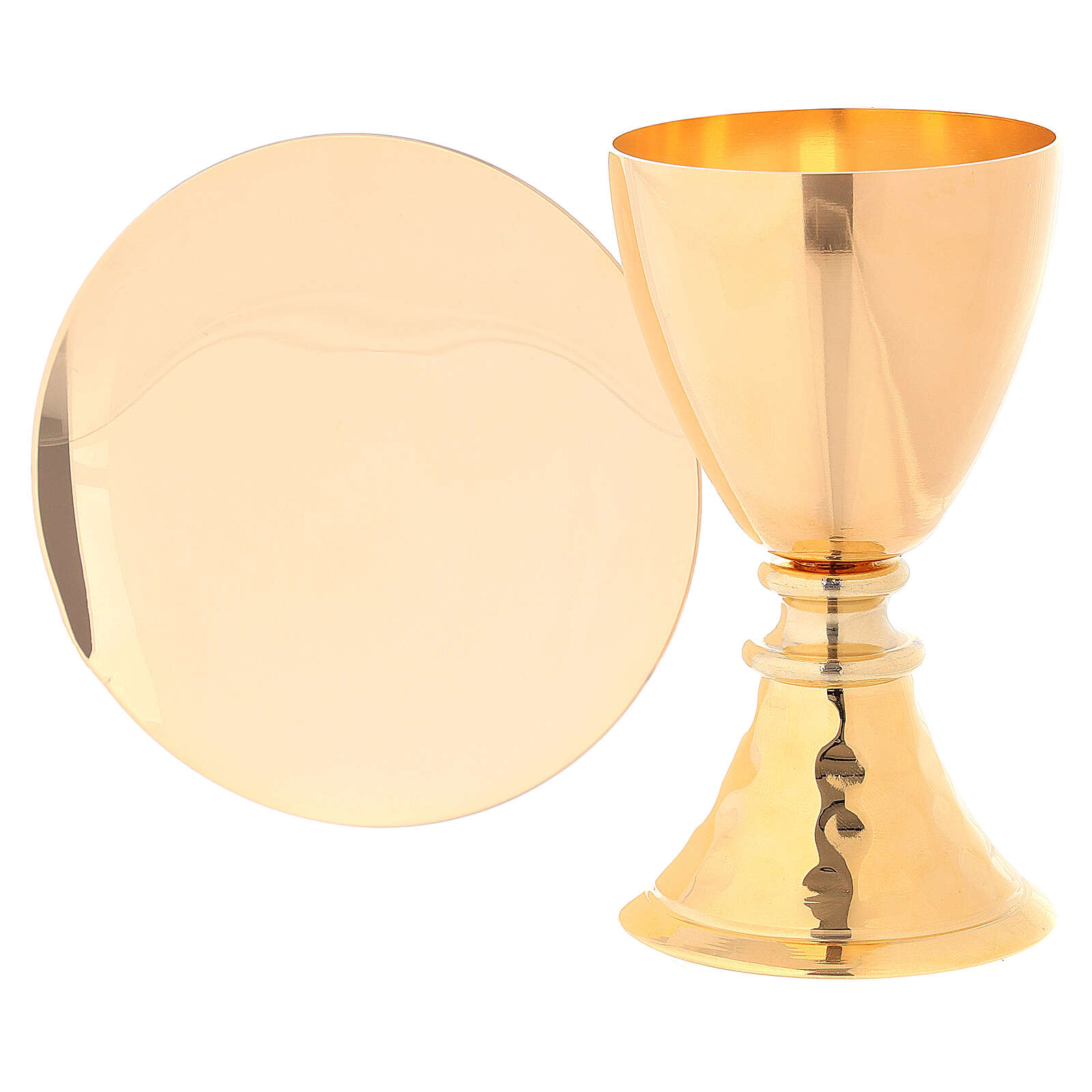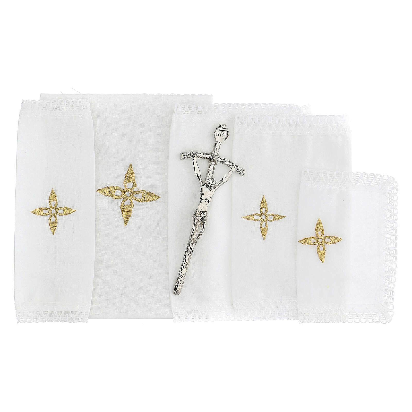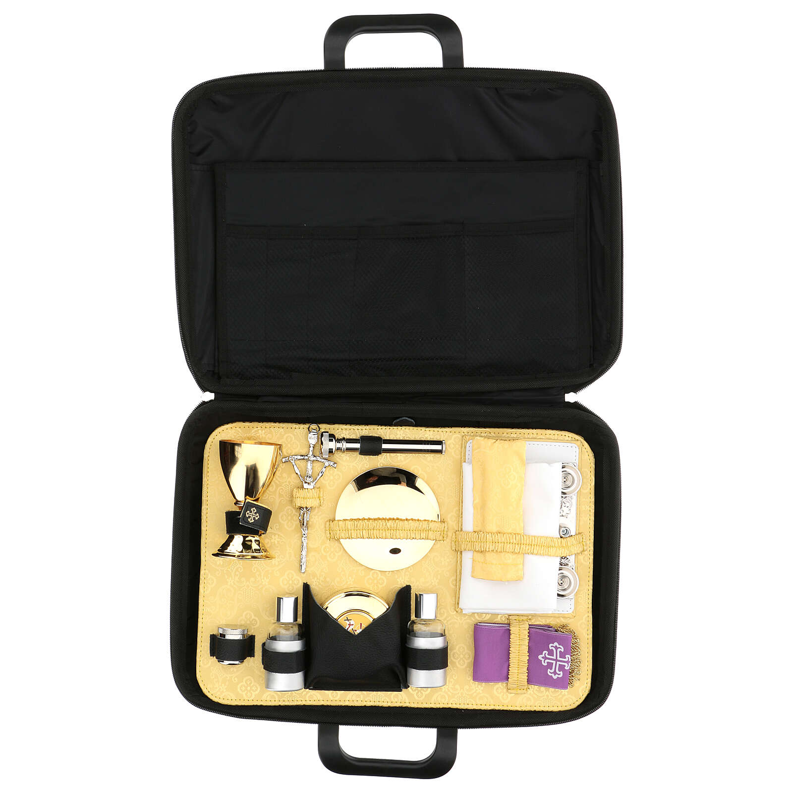 Computer bag with celebration set and yellow jacquard lining. Artificial leather computer bag with shoulder belt and yellow jacquard panel containing a mass kit with: sprinkler, 24-karat gold plated brass chalice, paten, Holy oil stock, pyx, 30 ml cruets, cast altar with cross and candles sockets, altar cross and wax candles, altar linens with golden embroidered cross and stole.