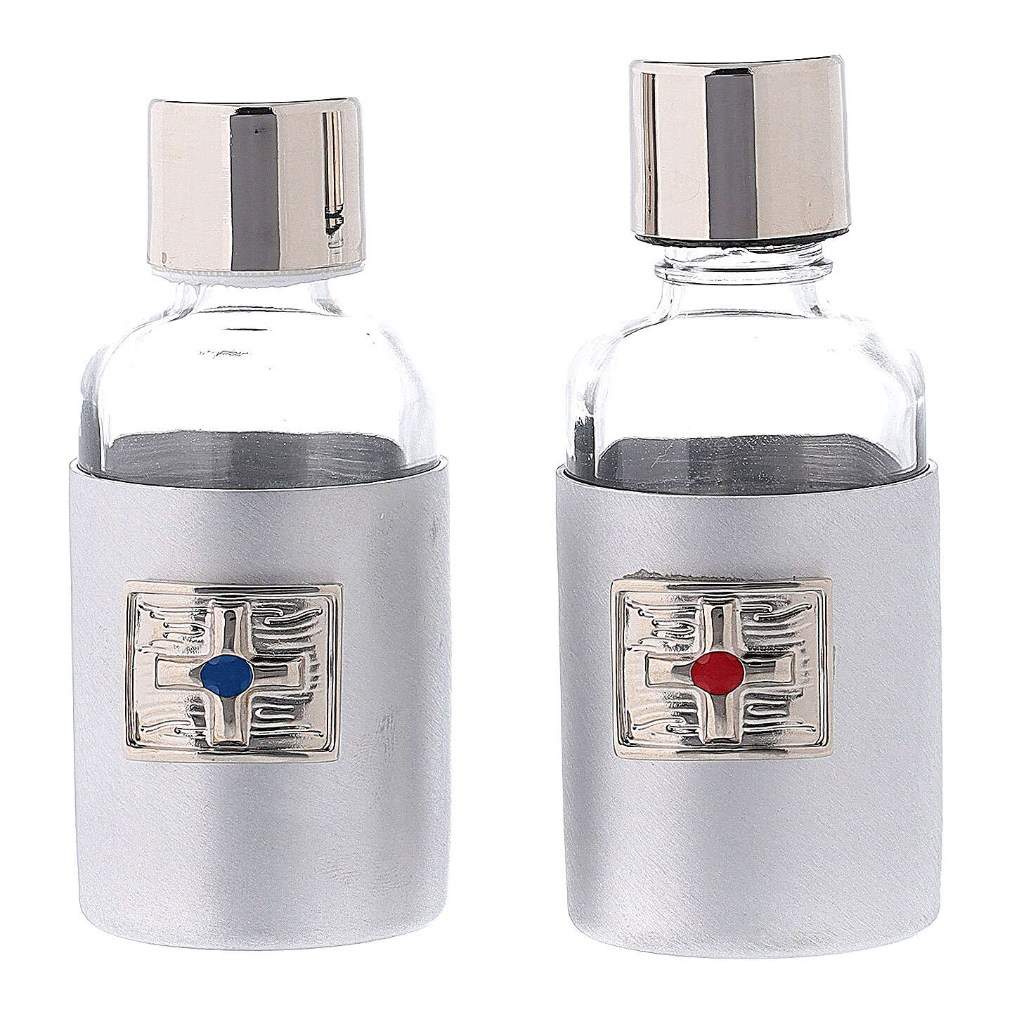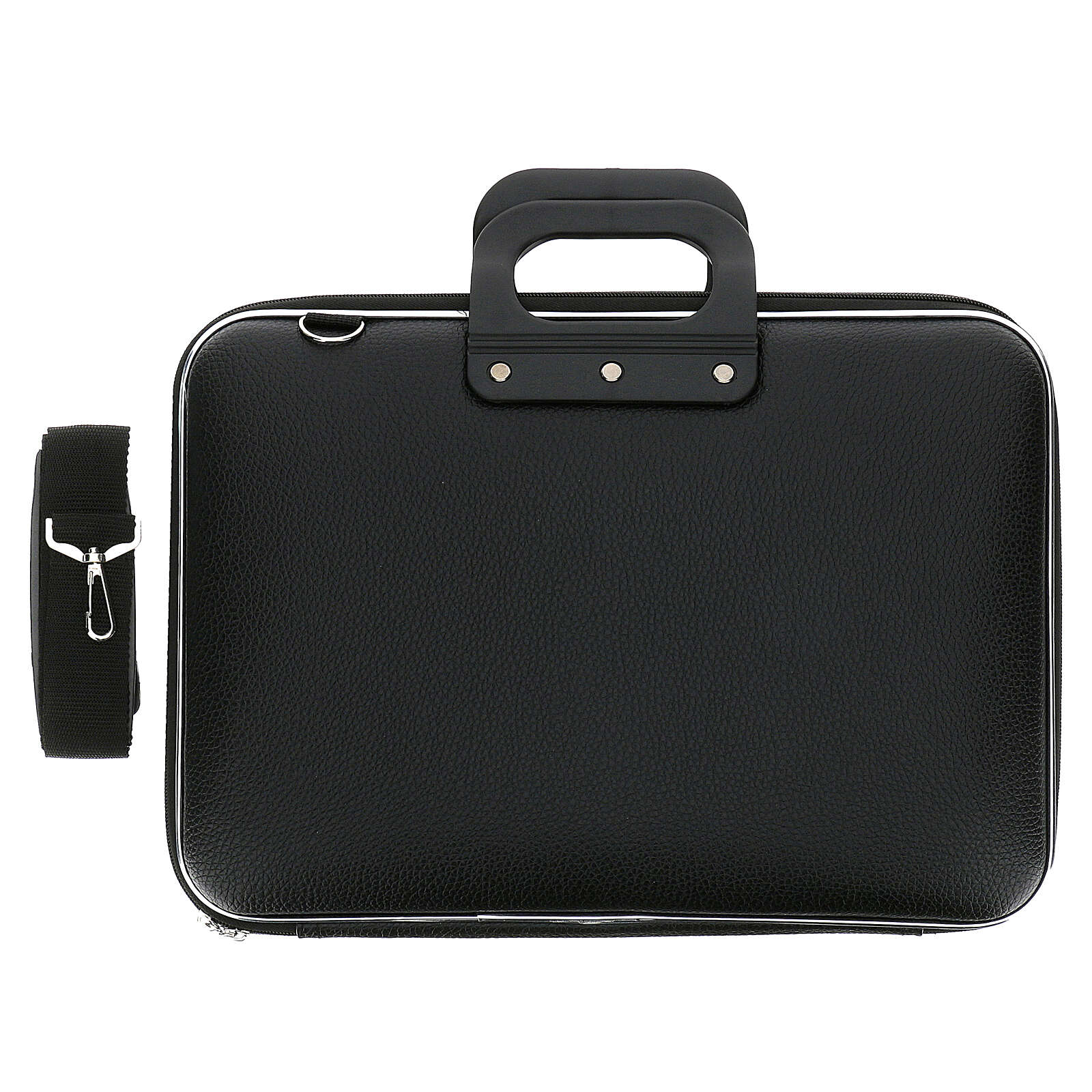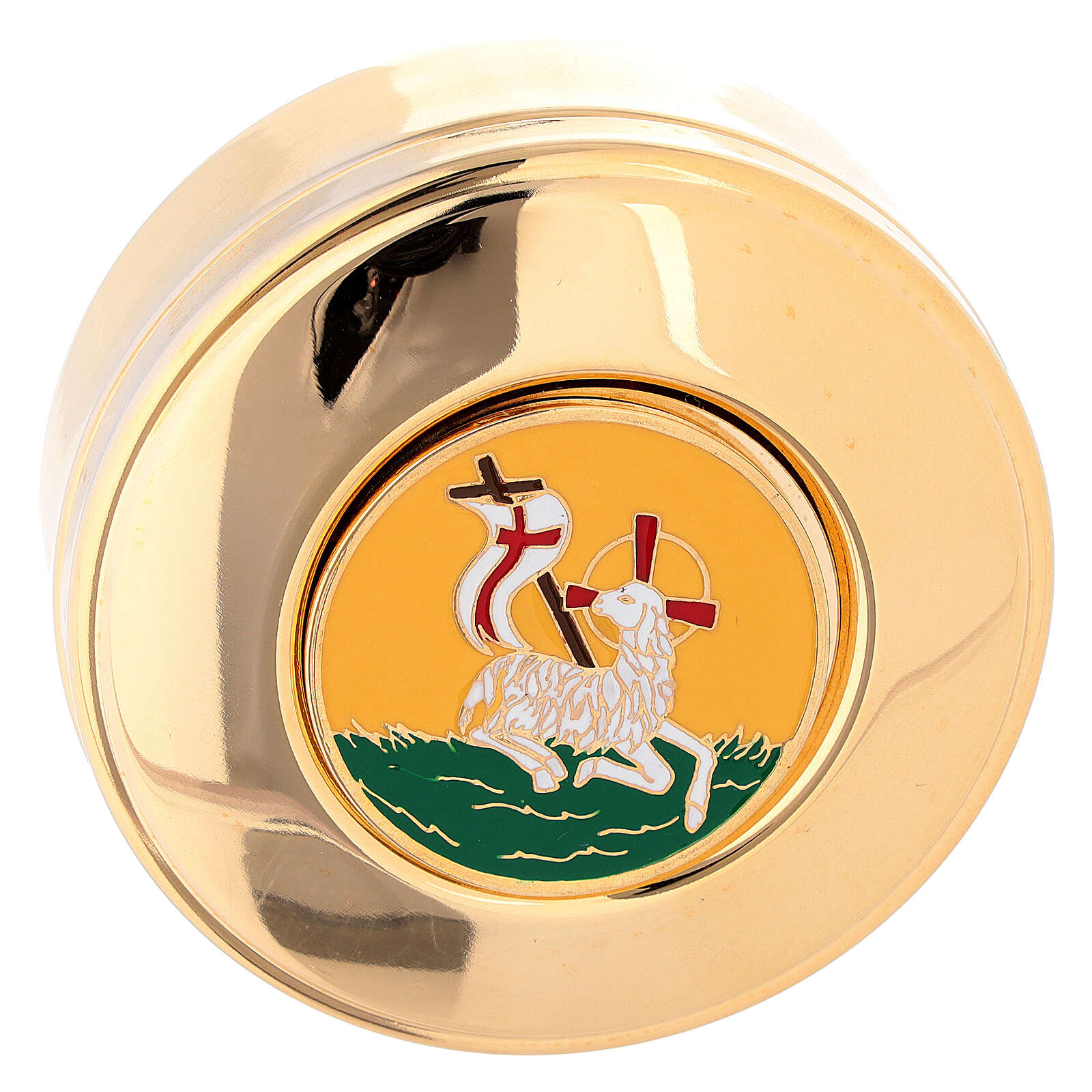 Computer bag with celebration set and yellow jacquard lining. Artificial leather computer bag with shoulder belt and yellow jacquard panel containing a mass kit with: sprinkler, 24-karat gold plated brass chalice, paten, Holy oil stock, pyx, 30 ml cruets, cast altar with cross and candles sockets, altar cross and wax candles, altar linens with golden embroidered cross and stole.