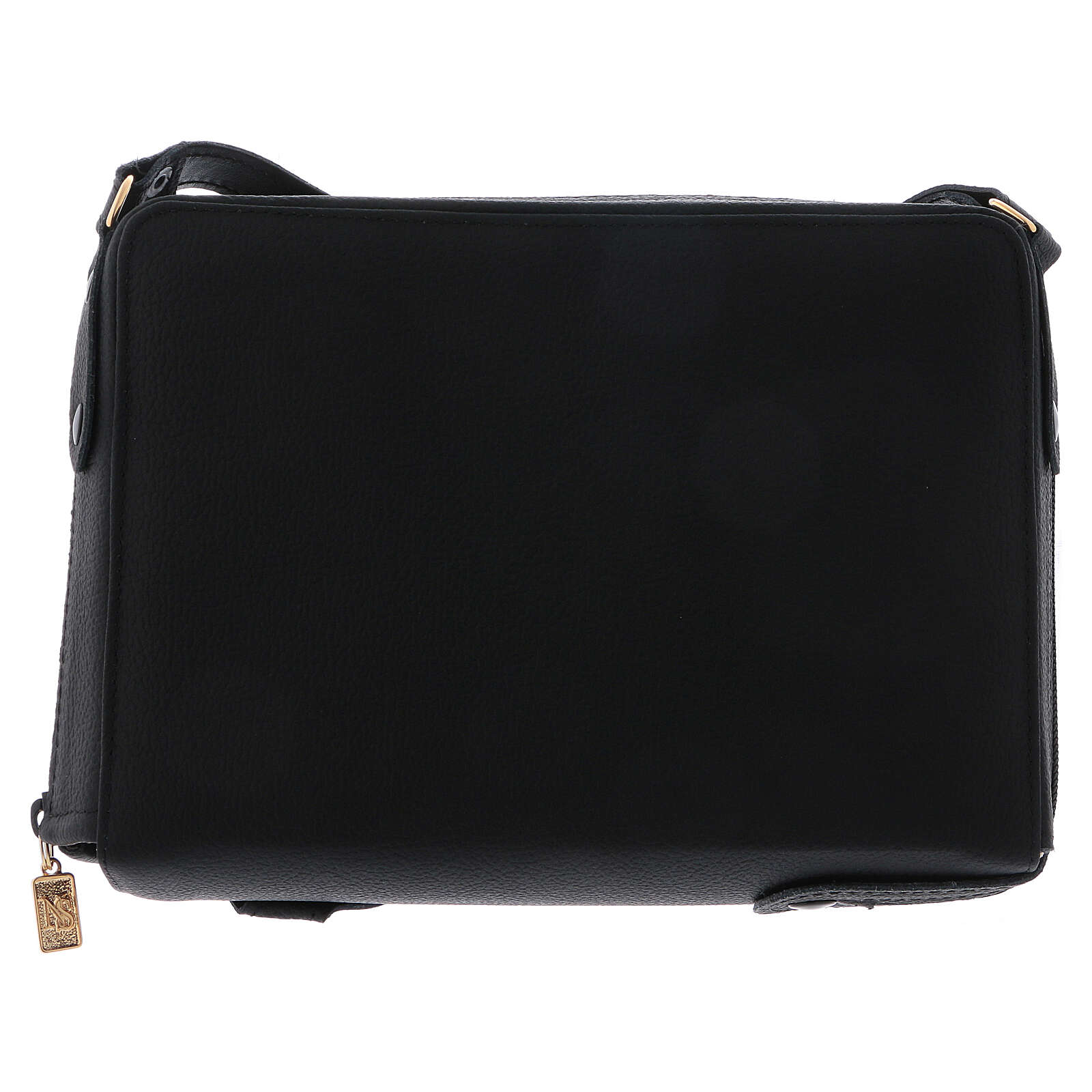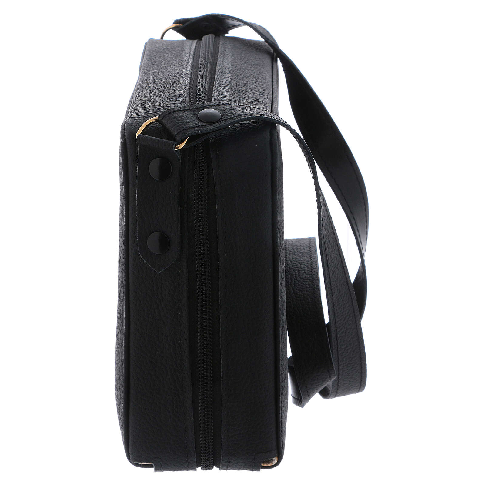 Leather and golden satin bag with mass kit. Shoulder bag in black leather with golden satin lining, containing a travel mass kit: chalice in 24-karat gold plated brass, bowl with host slide, decorated pyx, altar with candle and crucifix holders, cruets of 30 ml each, bicolored crucifix and wax candles, Holy oil stock, bicolored stole and altar linens with embroidered cross.
