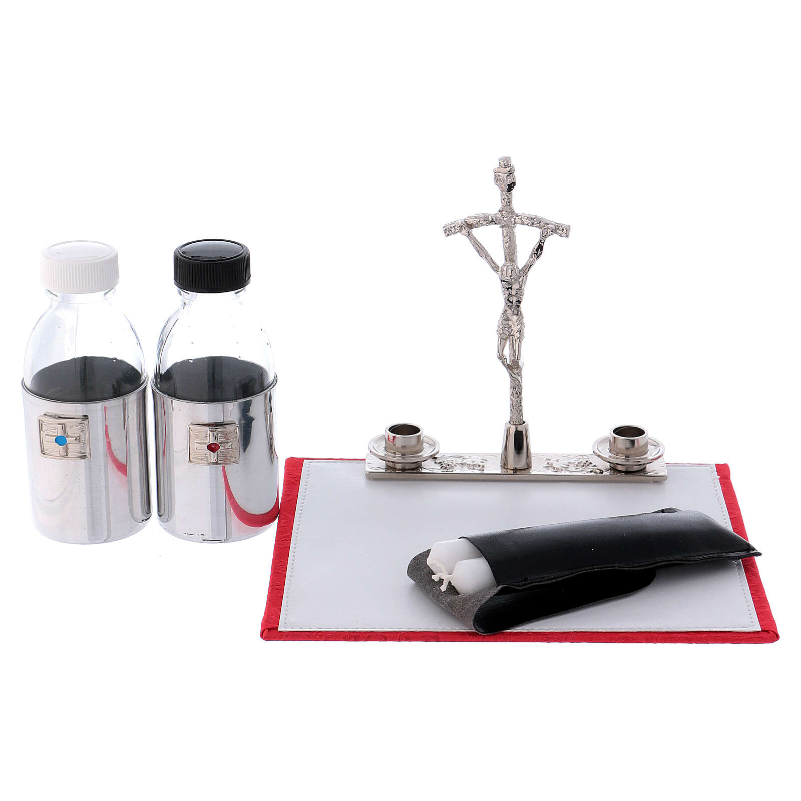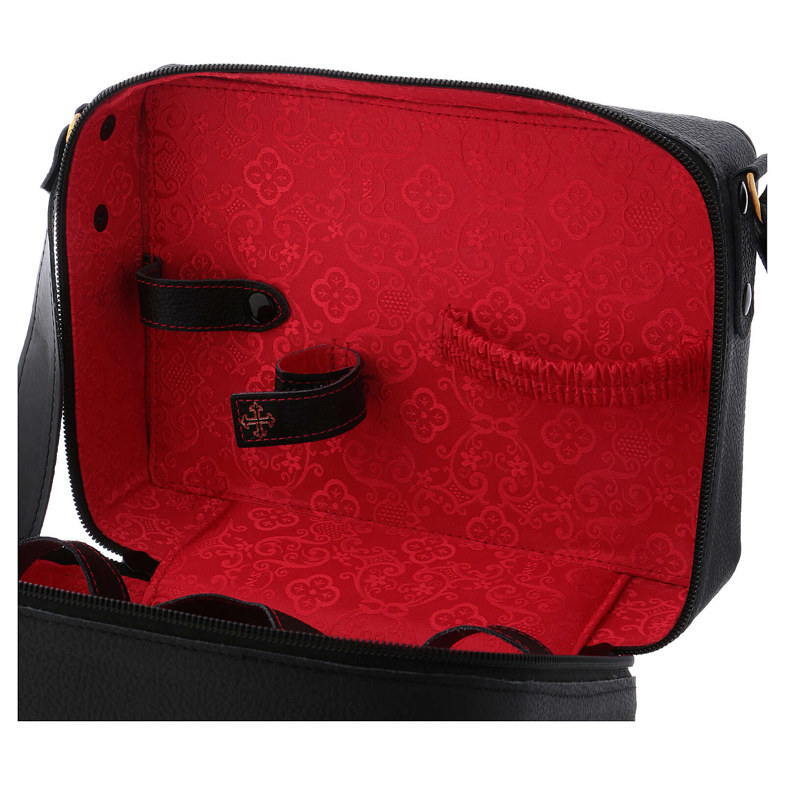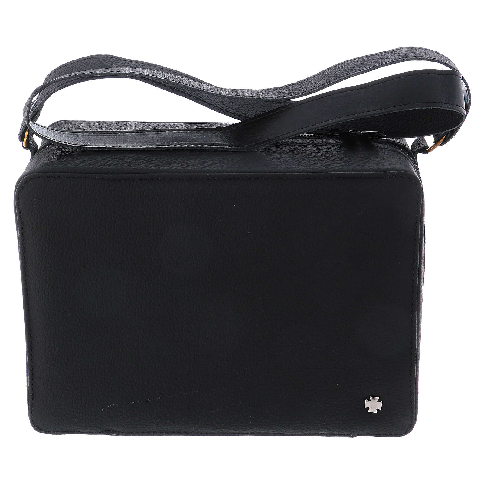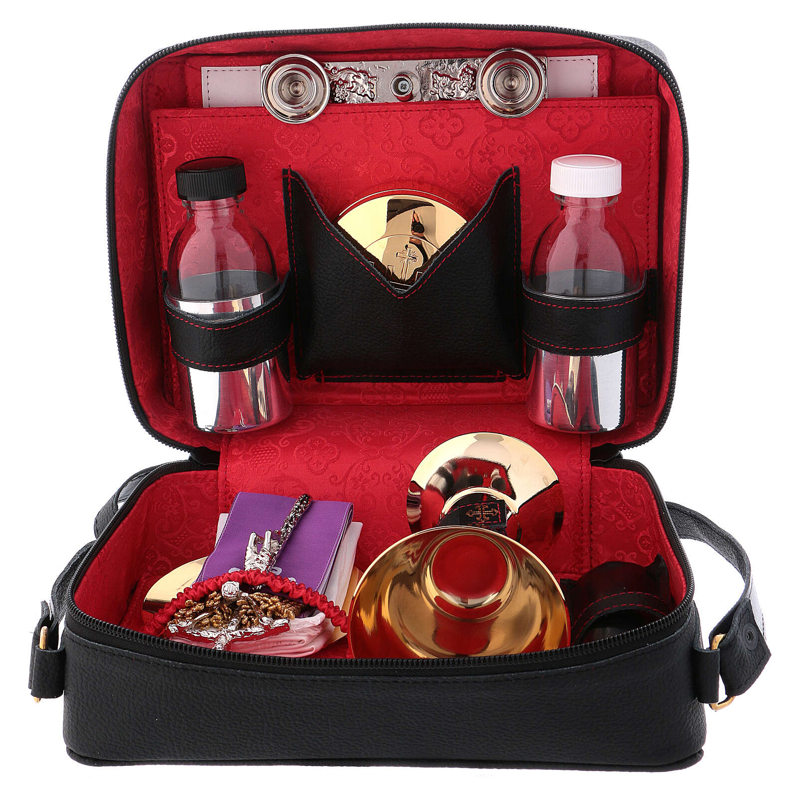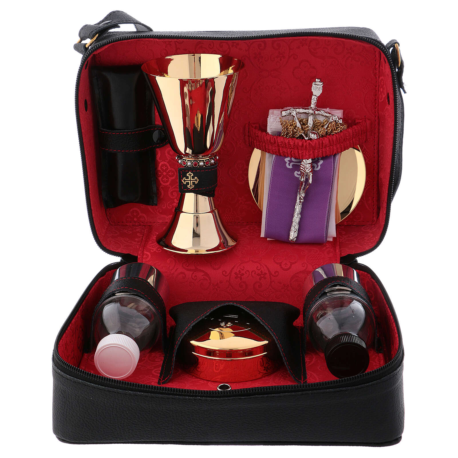 Leather shoulder bag with chalice of 5.9 inches high. Leather shoulder bag with red fabric lining and mass kit, which includes: a gold plated brass chalice with hammered finish of 5.9 inches high and a cup of 3.2 inches diameter, a pyx of 3.2 inches with IHS engraving, cotton altar linens, a plate of 3.9 inches diameter, a bicolored stole, two cruets, an altar, two candles and a cross.