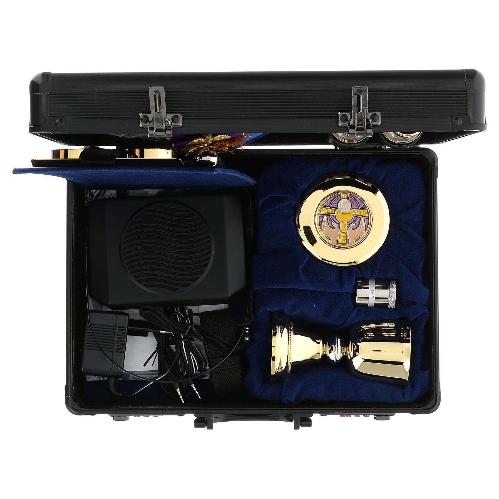 Mass kit for priests has case with amplifier and it is ideal for travelling, camping and outdoor celebration.