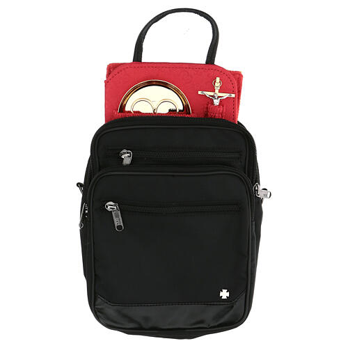 This bag contains a complete mass kit with chalice in 24-karat gold plated brass with inner pyx, sprinkler, paten, Holy oil stock, altar with cross and candles stands, wax candles, altar cross, 30 ml cruets, bicolored stole and altar linens with golden embroidered cross.