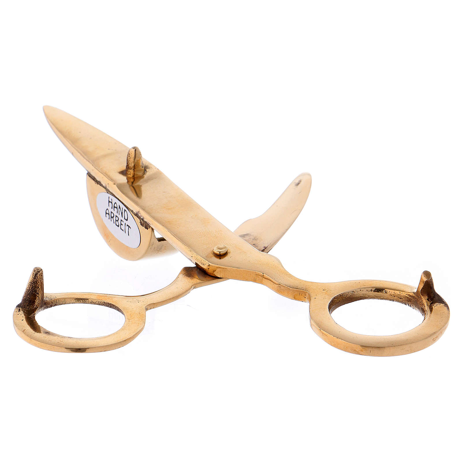 Antique gilded brass candle scissors, 6 inches long. Scissors to shorten the candle wick if necessary. The cotton wick falls into the specific housing without touching the cup, thereby ensuring perfect combustion.