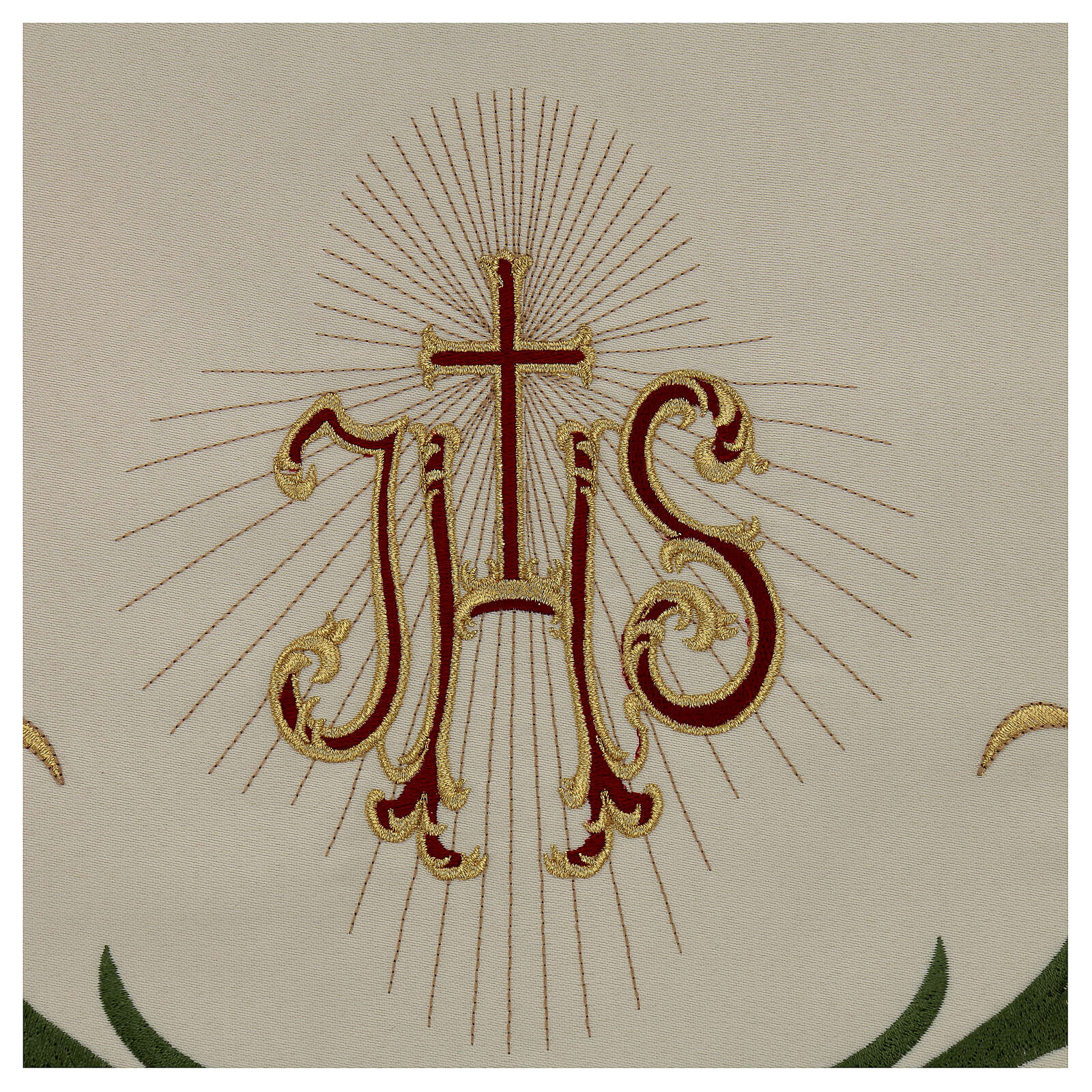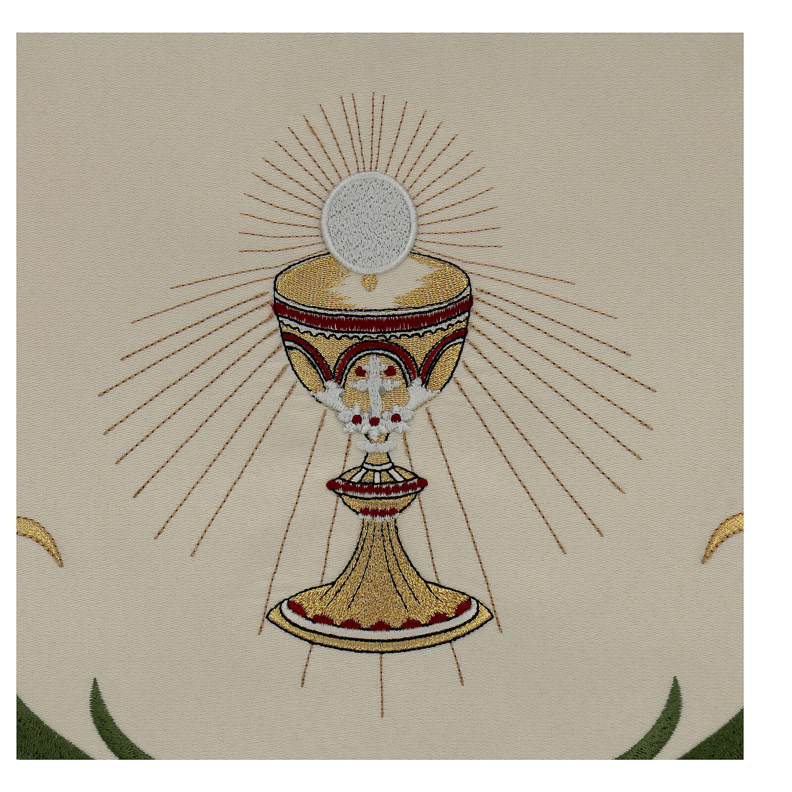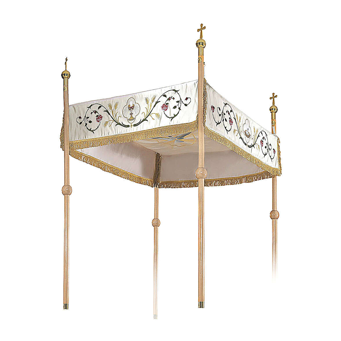 Processional canopy 130x160 with IHS, flowers and ears of wheat. The fabric is water proof and very resistant to possible tears. The sides of the processional canopy are decorated with the chalice, the lamb of God, IHS Christogram and the pelican which represents the Eucharist. The cover of the canopy is decorated with the dove of the Holy Spirit. The beams are not included but are available on estimate.