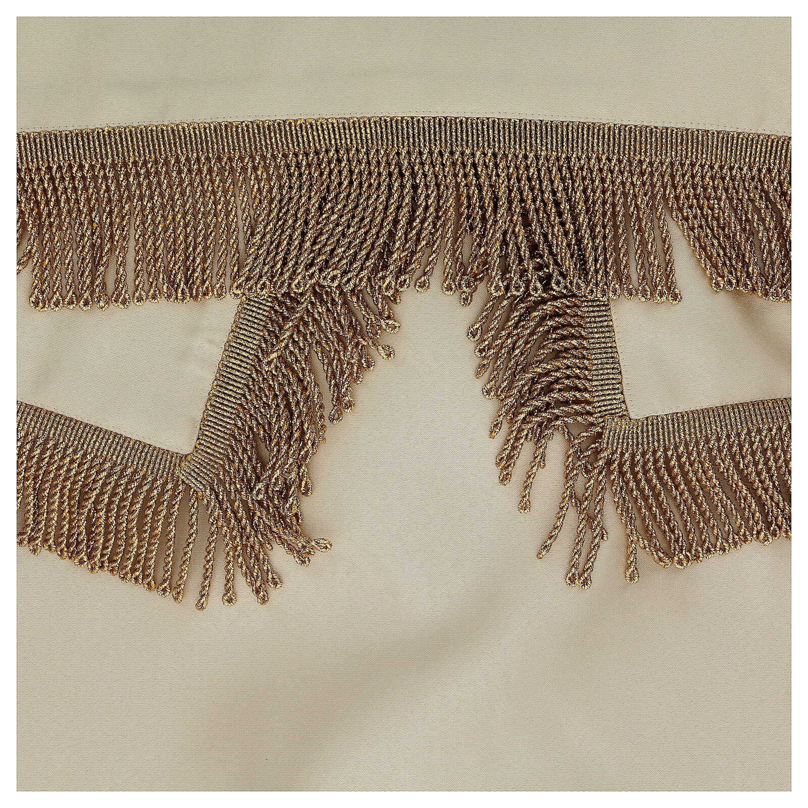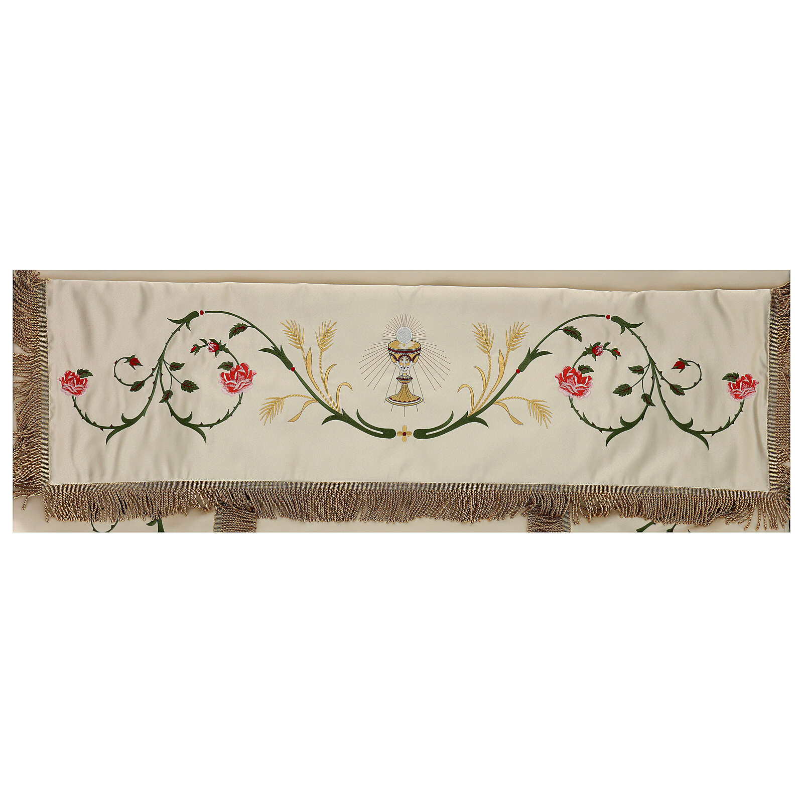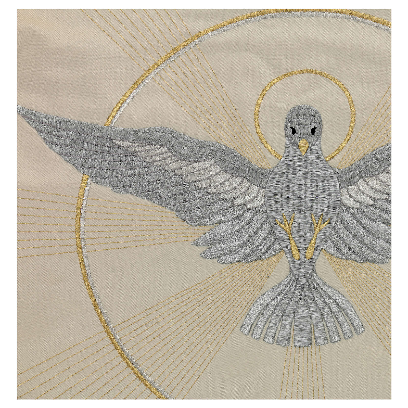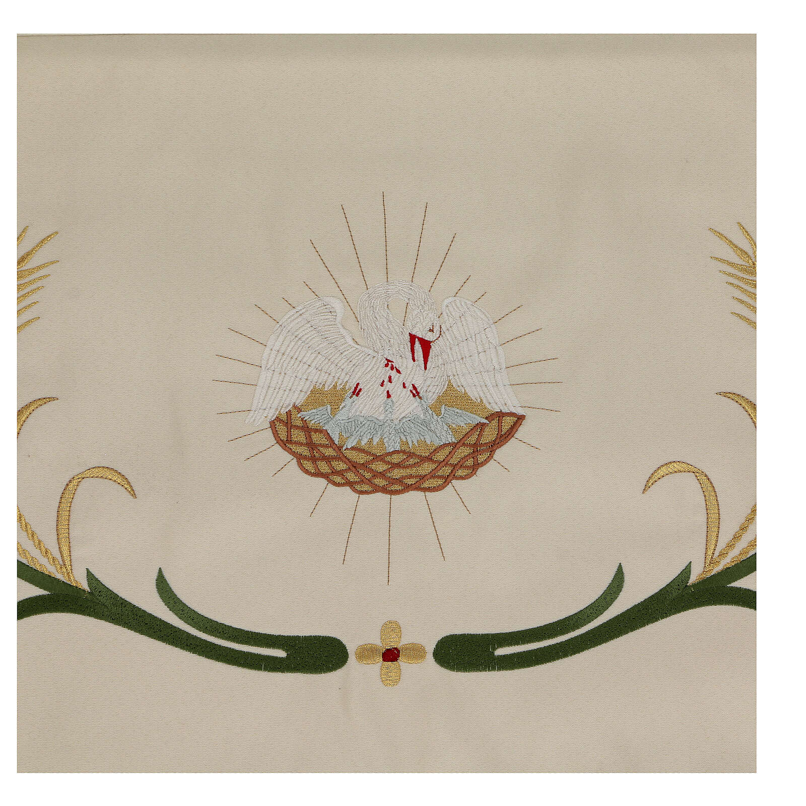 Processional canopy 130x160 with IHS, flowers and ears of wheat. The fabric is water proof and very resistant to possible tears. The sides of the processional canopy are decorated with the chalice, the lamb of God, IHS Christogram and the pelican which represents the Eucharist. The cover of the canopy is decorated with the dove of the Holy Spirit. The beams are not included but are available on estimate.