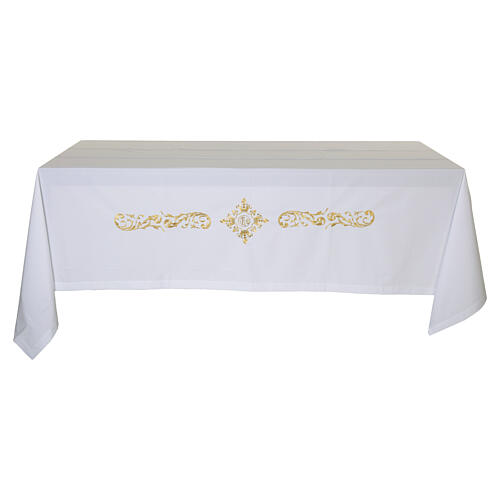 Ivory church altar cloth with golden IHS embroidery, 160x300 cm. The liturgical cloth is made of ivory fabric and features a decorative band along the front edge. At the center of the band is the IHS monogram, entirely embroidered in gold thread, surrounded by scrolling and floral ornaments that extend to the sides, also in gold thread. Made in Italy.