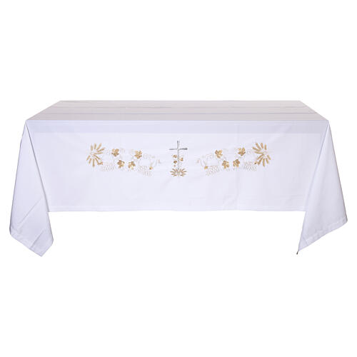 Large white altar cloth, 160x300 cm, with decoration concentrated on the front central band. The focal point is a two-tone embroidery that pairs a silver-thread cross with gold-thread ears of wheat—traditional symbols of the Eucharist and of Sacrifice.