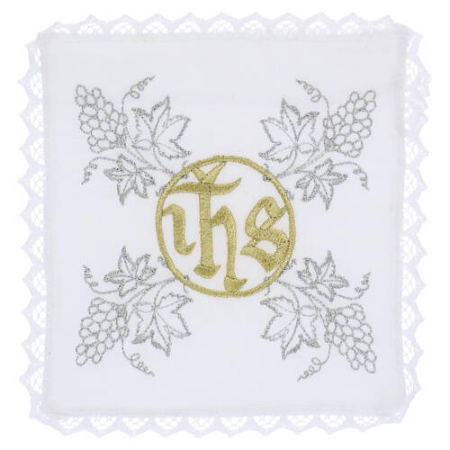 Altar linen set for Mass with JHS, gold embroidery and silver grapevine. This complete altar linen service is made of linen fabric, ideal for use on liturgical linens. The mass set includes the altar linens: corporal, purificator, pall and hand towel, and is distinguished by refined two-tone embroidery. The central element is the JHS monogram embroidered in gold thread, surrounded by clusters of grapes and vine leaves embroidered in silver thread, creating a striking chromatic contrast and a cle...