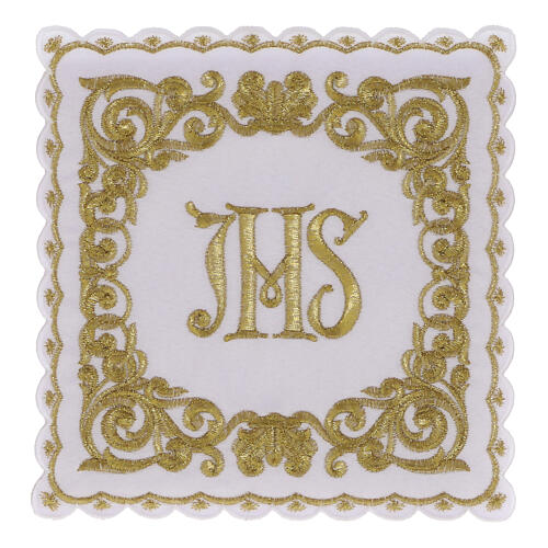Altar mass linen set In Primis JHS white gold cotton blend. This Catholic linen set is a Mass Service that includes four pieces:Polyester pall (16.5x16.5 cm),Purifier in cotton blend (23.5x17.5 cm),Cotton blend manuterge (23.5x17.5 cm),Cotton blend corporal (46.5x46.5 cm). This mass linen set is part of the In Primis by Haftina line, a collection exclusively for Holyart which selects the best designs and materials to accommodate and satisfy the needs of priests. The pall is decorated with the letters JHS embroidered in gold, surrounded by a golden line with floral motifs. A removable cardboard is inserted inside to keep it rigid.