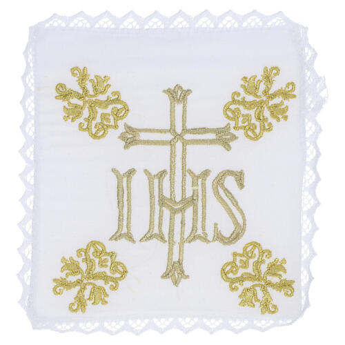 Complete Mass linen set in 100% pure linen including corporal, purificator, chalice pall and lavabo towel. The central emblem is the IHS monogram embroidered in gold thread, framed by delicate floral motifs and scrolls that enhance the set's solemn liturgical character. Dimensions: