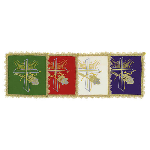 Rigid liturgical pall (chalice cover) with central embroidery depicting a cross, a bunch of grapes and ears of wheat quintessential Eucharistic symbols. The edge is finished with a gold braid trim that enhances its liturgical appearance. A sacred parament made in Italy, practical and durable thanks to its plasticized internal structure. Available in the four standard liturgical colors for the different seasons of the liturgical year.