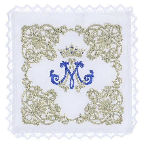 Marian Mass linen set in pure linen with golden floral embroidery. This complete Catholic Mass set is made of pure linen and includes the altar linens: corporal, purificator, chalice pall and lavabo towel. The distinguishing feature is the Marian embroidery combining the Marian monogram with a rich decoration of floral motifs, vines and scrolls. The entire embroidery is executed in gold thread, giving the set a luminous and solemn character suited to celebrations dedicated to the Blessed Virgin ...