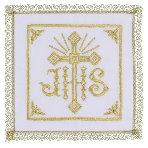 Mass altar linen set featuring a JHS monogram and central embroidered cross in gold thread with geometric details. The motif is repeated on the purificator and on the corners of the corporal; edges are finished with white lace. Made in Italy from durable linen fabric, designed for daily liturgical use. The design highlights the Christological symbol with a balanced, symmetrical decoration.