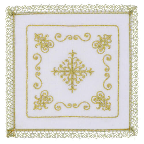 Altar mass linen set in linen with a central baroque motif and a stylized cross embroidered in gold thread. The decoration is applied to the pall, the purificator and the corners of the corporal; edges are finished with white lace trim. Made in Italy and designed for use during the Eucharistic mass celebration, the composition displays an elegant, symmetrical ornamental design.