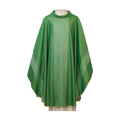 Classic Priestly Chasuble Wool Silk Lurex Vebi Confezioni. The Classic Wool Silk Lurex Priest Chasuble is a garment of great refinement and sobriety, ideal for the most solemn celebrations. Crafted without embroidery, it stands out for its clean and essential line, enhanced by a precious golden trim running along the entire perimeter, bringing light and dignity to the celebrant's figure. The design is complemented by an elegant inverted ring collar, accentuating its harmony and classic cut. With dimensions of approximately 150x130 cm, this liturgical chasuble provides a comfortable and fluid fit, suitable for all body types. It is accompanied by its coordinated stole, for a complete and consistent liturgical ensemble. Available in the four traditional liturgical colors, it is entirely handmade in Italy with fine fabrics and great attention to detail. A unique chasuble, designed for those who wish to celebrate with elegance, sobriety, and deep spirituality. It is created by Vebi Confezioni, where tradition and quality meet in service to the liturgy.