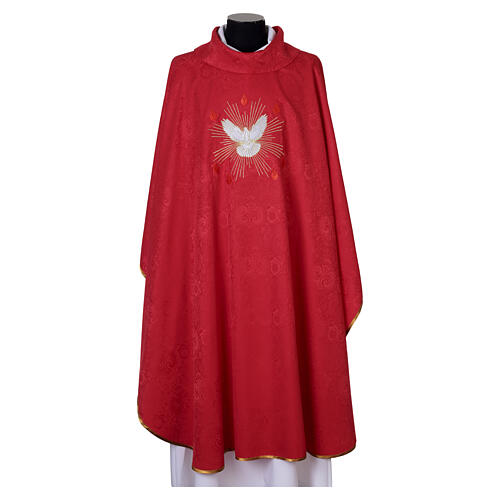 Damask chasuble with matching stole, embroidered with the symbol of the Holy Spirit. The Catholic chasuble features a raised collar, an ornate decorative braid and a fine liturgical damask fabric in a deep, solemn red with an all‑over floral pattern that gives luminosity and dignity. The liturgical vestment is enriched by a central embroidery of the Dove of the Holy Spirit surrounded by rays and tongues of fire, symbolizing Pentecost and the Sacrifice; the embroidery is executed with precision on both the front and the back. The full, flowing cut ensures a comfortable and majestic fit for liturgical use. Finished with a gold perimeter border, the chasuble is supplied with a matching stole and is crafted by specialists in sacred vestments.
