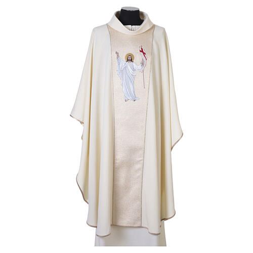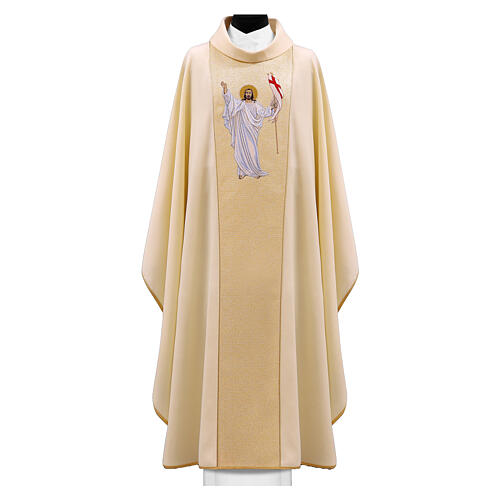 Gold Chasuble with Risen Jesus Embroidered Golden Stolon. Golden polyester priest chasuble, measuring 125x67 cm, adorned with an embroidered stolon that gives it a solemn and refined appearance. At the center of the stolon, Jesus Christ is depicted just risen, with his arms raised. He holds the banner of Saint George in his left hand, while the stigmata is visible in his right hand, a symbol of faith and redemption. The edge of the chasuble is finished with an elegant golden thread that highligh...