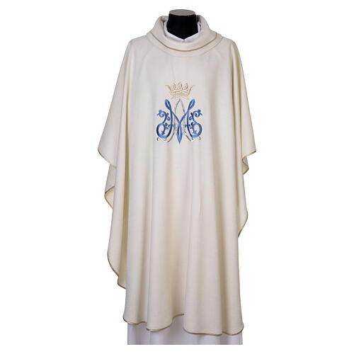 Ivory Marian chasuble with light blue embroidery. Liturgical chasuble crafted from ivory-colored fabric with a classic, generous cut that ensures a comfortable fit and a fluid drape. The Catholic chasuble features a central vertical stole and a raised collar in light blue figured (brocade) fabric; both elements display a worked texture that adds a subtle chromatic distinction, making this vestment especially suitable for celebrations in honor of the Blessed Virgin Mary. The vestment and its fitt...