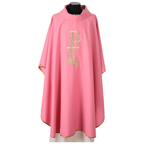 Pink polyester chasuble with PAX grape and wheat embroidery. The priest chasuble is made entirely of sturdy and high-quality pink polyester fabric. It is adorned with a golden cross, along with sheaves of wheat and grapes, symbols of Christ's sacrifice. The pink Catholic chasuble includes a stole matching the chasuble color.