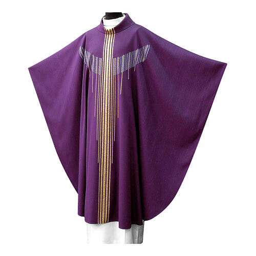 Purple chasuble cross braided fabric. Priest chasuble made of fine hand-woven wool fabric, subsequently machine-sewn to ensure resistance and durability. The decorative cross on the chest is worked in the center with gold threads and enriched on the sides with purple colored wool threads, selected for their very high quality and diversity of thickness, which give depth and refinement to the design. A matching stole is included, also crafted with care, to complete the ensemble harmoniously. A uni...