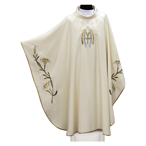 White Marian Chasuble with Lily Sleeves in polyester. Priest chasuble with a white base, adorned with machine embroidery on the chest that adds a touch of sophistication. The central monogram of Mary is embroidered with silver and gold threads, giving brightness and understated elegance.
