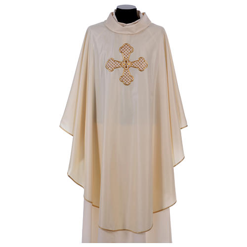 Liturgical Chasuble embroidered by hand in wool and silk, with white and gold decorations. The clergy chasuble is hand embroidered by the nuns of the monastery of Montesole. It is made using a fine gold and half fine gold yam. On the decorations there are some stones. The chasuble is complete with a stole that has small crosses and a gold braided border. Each passage of the processing is made in Italy. The handmade making makes these articles unique and particular.