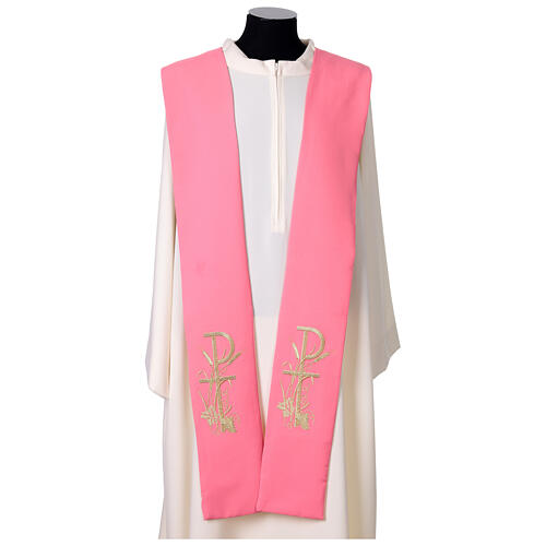 Pink priest stole with gold embroidery PAX grapes and wheat. Made of 100% polyester, this pink stole is adorned with machine stitching in gold thread on the front panels, depicting the symbol PAX, accompanied by a bunch of grapes and two wheat spikes, significant Eucharistic symbols. Measuring 258 cm, this clergy stole is perfect for adding elegance and solemnity to liturgical celebrations.