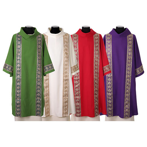 High-quality polyester dalmatic vestment with applied gold border. Made of premium polyester fabric, adorned with a gold applied border that enhances its silhouette and adds solemnity to the garment. It is delivered with a matching stole, crafted with the same materials and finishes for a harmonious and elegant ensemble. Each deacon dalmatic is handmade in Italy by a family-run business founded in the early 1960s in a picturesque village nestled among the Piedmont hills. A liturgical vestment th...