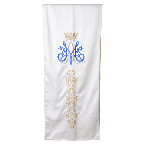 Ivory pulpit lectern cover for Marian celebrations. This liturgical pulpit cover in ivory fabric is specifically designed for Marian festivities and is made in Italy. The horizontal decoration features a central Marian monogram embroidered in the traditional blue and silver tones, surmounted by a golden crown. Below the monogram, the panel is enriched with ornate motifs and floral scrolls harmonized in color with the center, adding elegance to the ambo (lectern). Dimensions: 240 x 50 cm.