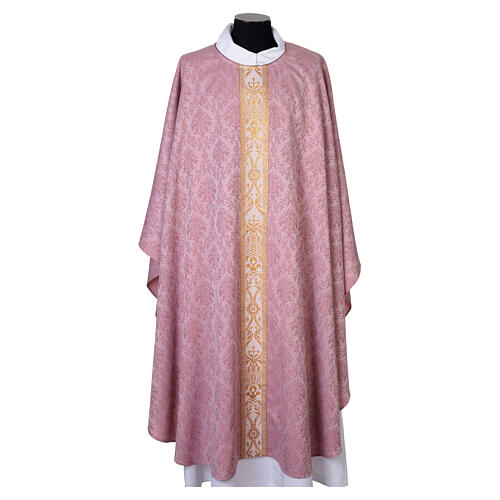Pink Gothic chasuble with small braided galloon by Slabbinck. This pink Gothic-style chasuble is crafted by the Belgian atelier Slabbinck, a specialized workshop in the artisanal production of high-quality liturgical vestments. It features a small galloon with intertwined golden pattern and damask fabric. it includes a matching stole. Each vestment is a work of art on its own, distinguished by the original embroidery design and the meticulous selection of materials, combined with craftsmanship a...