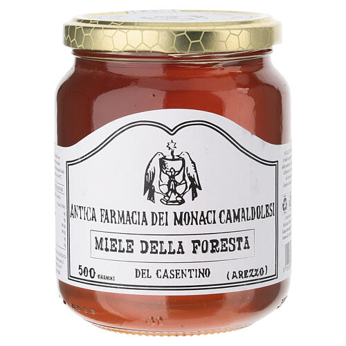 Casentino Forest honey 500 g Camaldoli. This honey comes from bees that collect nectar and honeydew in the hills of Casentino, within the woods surrounding the Monastery of Camaldoli, an area of unspoilt nature and rich botanical diversity. The forest environment gives the honey an intense, distinctive aromatic profile. This natural honey is cold-extracted and unpasteurized, a processing method that preserves the natural properties and original qualities of the honey. Each jar contains a genuine product, the result of the bees' activity and their natural environment. Crystallization is a natural phenomenon that can occur over time and is a mark of authenticity. To restore a more liquid consistency, warm it in a water bath at about 40 degrees. Net weight: 500 g.