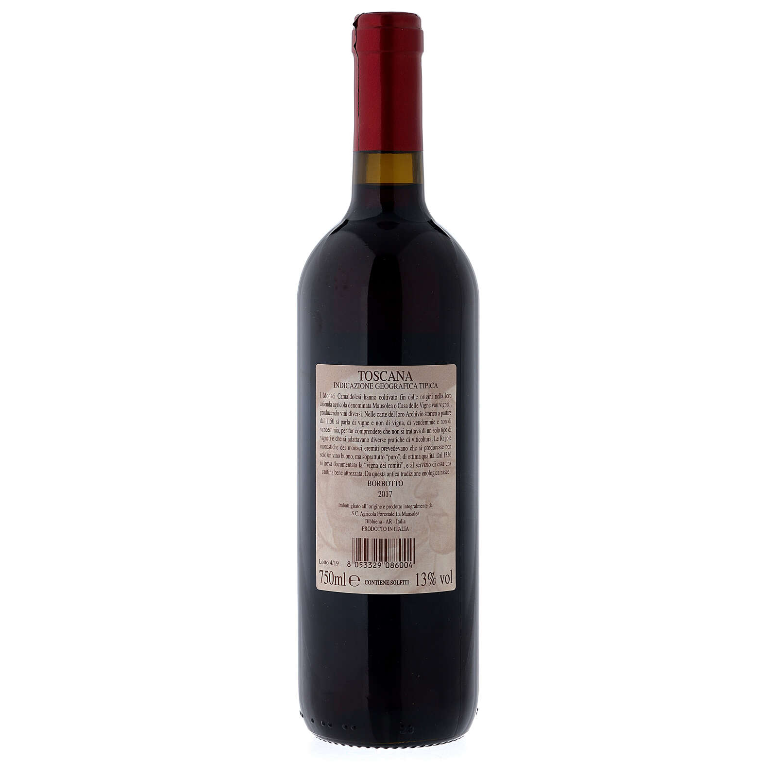 Bordotto red wine from Tuscany 750 ml - 2017. Wine made from grapes grown in Camaldoly Abbey in Tuscany. Wine made from Sangiovesto, canaiolo, malvasia near and merlot grapes. Maturation in wooden barrels for 12 months.