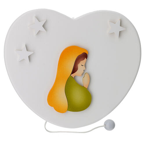 Our Lady of the Heart music box with yellow mantle 15.5x17 cm. This charming heart-shaped music box, handcrafted in Loppiano, is ideal for decorating a child's room. Made from wood in a delicate white finish, it features a half-bust of Mary at the center, adorned with an orange veil and a green robe. Her hands are joined in prayer and three slightly raised wooden stars complete the image. Pulling the cord on the back activates Brahms' gentle lullaby. More than a nursery ornament, this music box symbolizes the love and devotion contained in a simple prayer. Dimensions 15.5x17 cm.