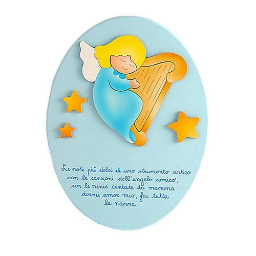 Oval wooden plaque depicting a blue angel playing the arp, this wooden plaque has also a nursery rhyme for children written on it. This work of art is entirely hand-made by the young artists of the Focolare movement of Loppiano