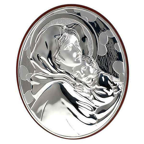 Silver, oval Bas Relief depicting the Madonna del Ferruzzi. This decorated Bas Relief is in anti-oxidizing laminboard silver.The surface is glossy and polished. The back side of the Bas Relief is in wood and it is provided with a tongue to be hanged ont he wall. The Bas Relief comes in a box and with certificate of authenticity. CLICK HERE to see it