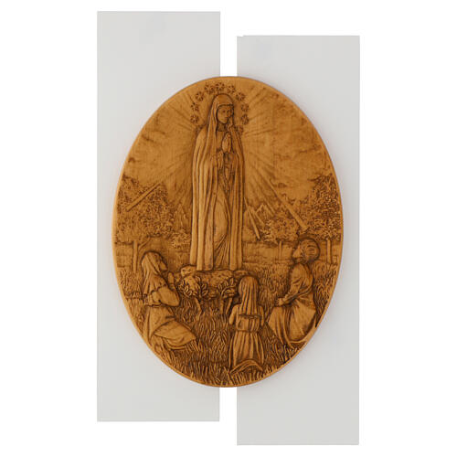 Bas-relief Our Lady of Fatima in solid beech wood with support in white painted fir wood, 53.5x32 cm. Bas-relief in solid beech wood depicting the apparition of Our Lady of Fatima. In total it measures 53.5x32cm, the beech part measures 37.5x28 cm and can be hung thanks to a golden metal hook. The beech wood Our Lady of Fatima has been 100% hand-finished by the artisans of Loreto and comes with a certificate of guarantee.