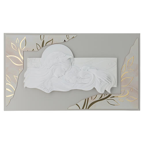 Modern relief panel depicting the Virgin and Child, finished in white tones with gold decorations. The central subject is modelled in relief and set against a decorated background with stylized motifs that enhance the composition. Designed as a decorative element for domestic interiors or dedicated devotional spaces, it suits a variety of settings. Fitted with two metal hooks on the back for secure and practical wall mounting. Dimensions: 40x70 cm.